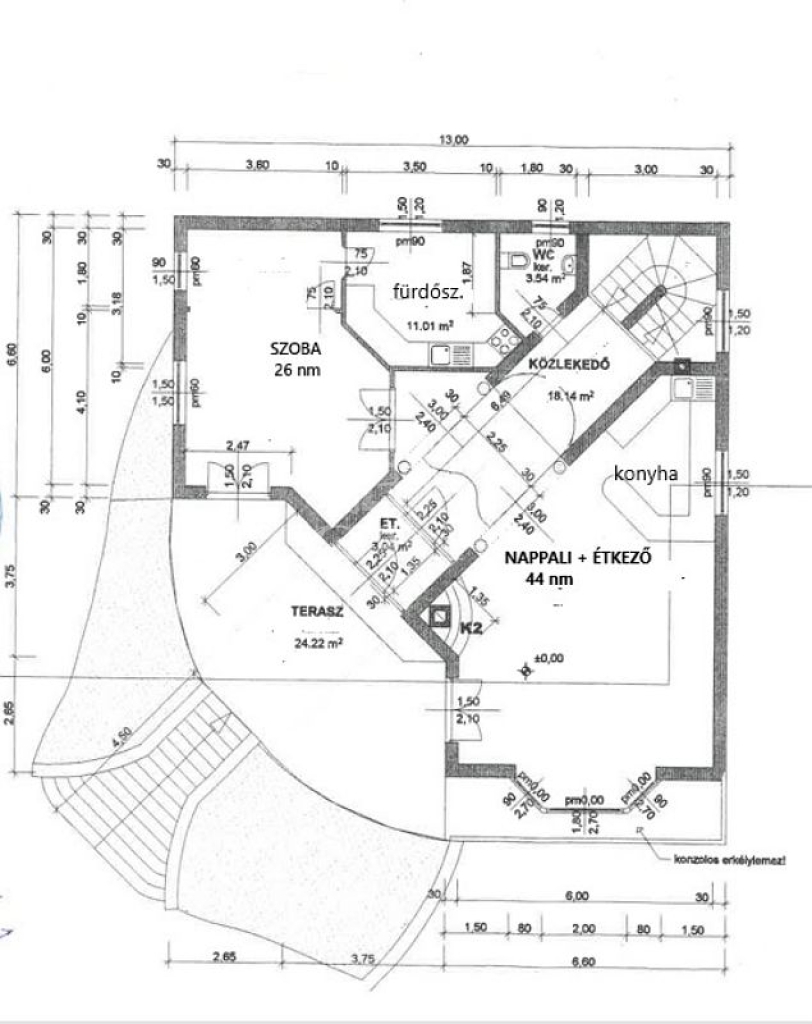 Földszint: nappali amerikai konyhával (44 nm) és teraszkapcsolattal, dolgozószoba (26 nm) , fürdő (11 nm) , WC, háztartási helyiség