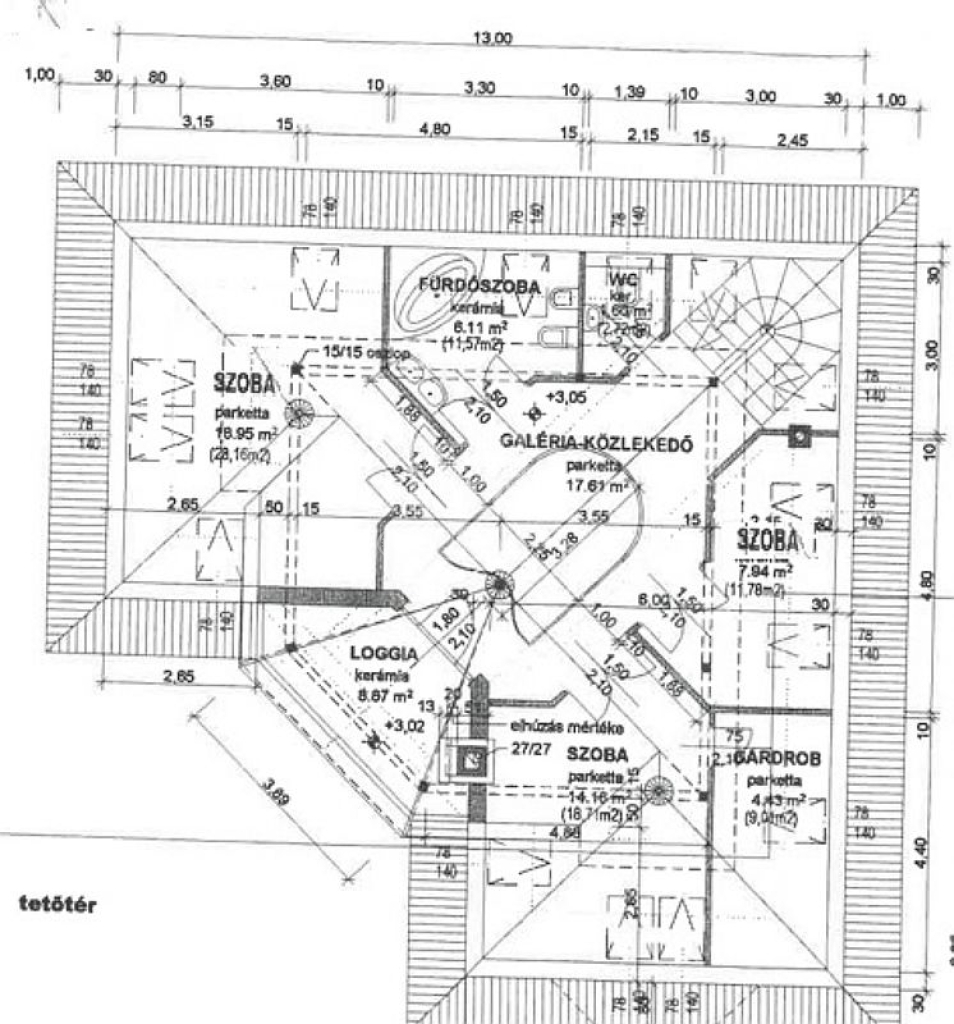Tetőtér: két háló (br. 28 és 18 nm), egy félszoba, gardrób, fürdő, külön WC, panorámás erkély
