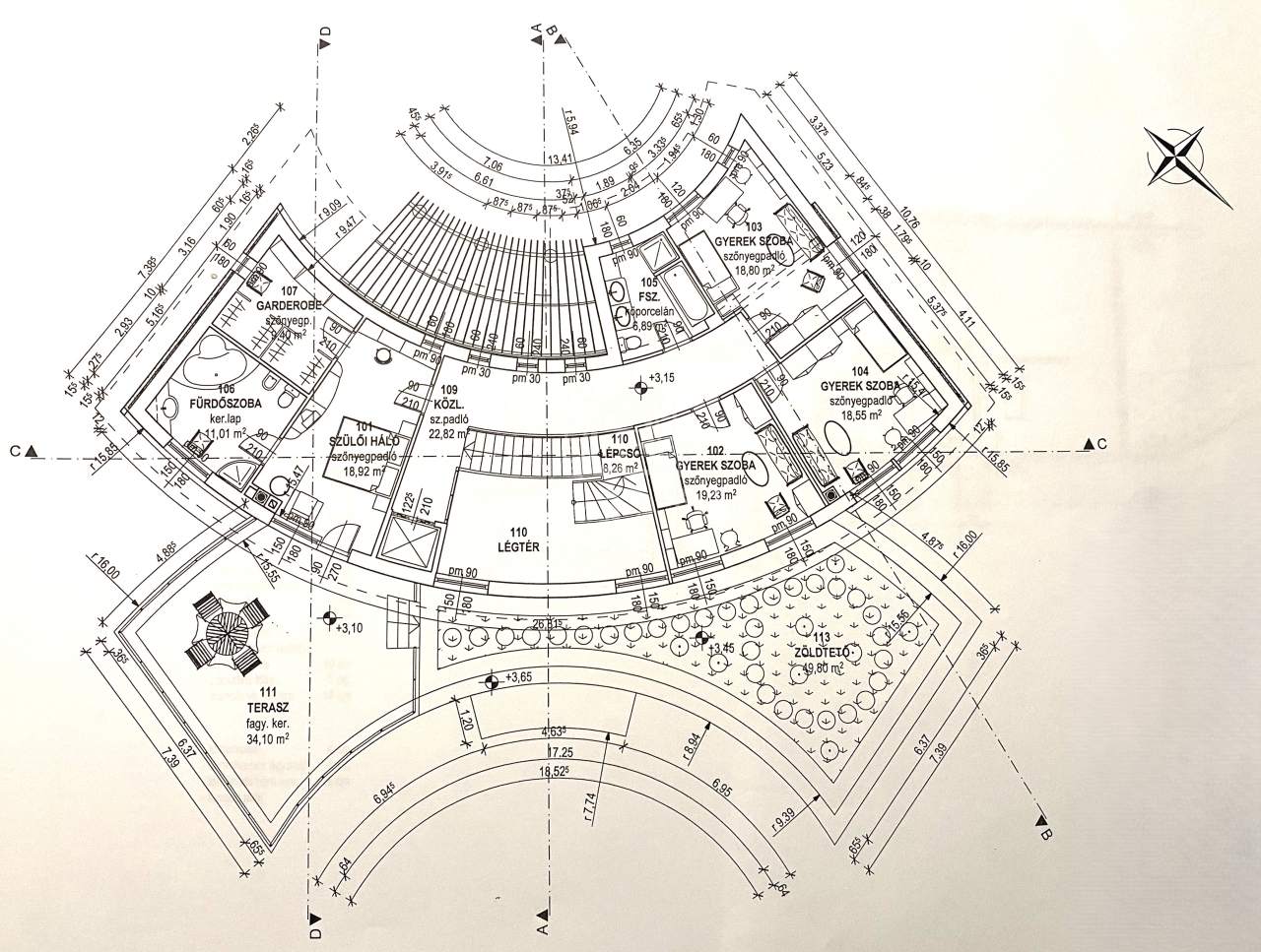 Az alsó szinten a teljes gépészet, tárolók és a ház működését kiszolgáló helyiségek kaptak helyet, míg a földszinten a mindennapi élet központja tárul elénk: egy tágas, amerikai konyhás nappali étkezővel, kamrával kiegészítve, dolgozószoba, valamint egy külön fürdőszobás vendégszoba biztosítja a kényelmet. A szintet egy kétállásos garázs, háztartási helyiség, valamint egy szauna zuhanyzóval teszi teljessé, miközben a nagy belmagasságú közlekedők tovább erősítik a térérzetet.