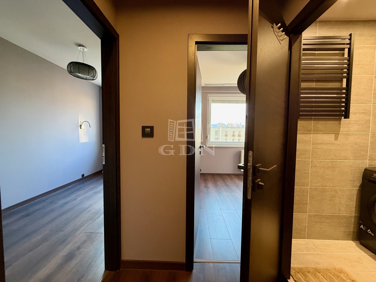 A hálószoba csendes, jól berendezhető, a fürdőszoba pedig modern, visszafogott stílusú, épített zuhannyal és minőségi burkolatokkal. A mosógép diszkréten, beépítve kapott helyet, a külön WC pedig érezhetően növeli a komfortot.