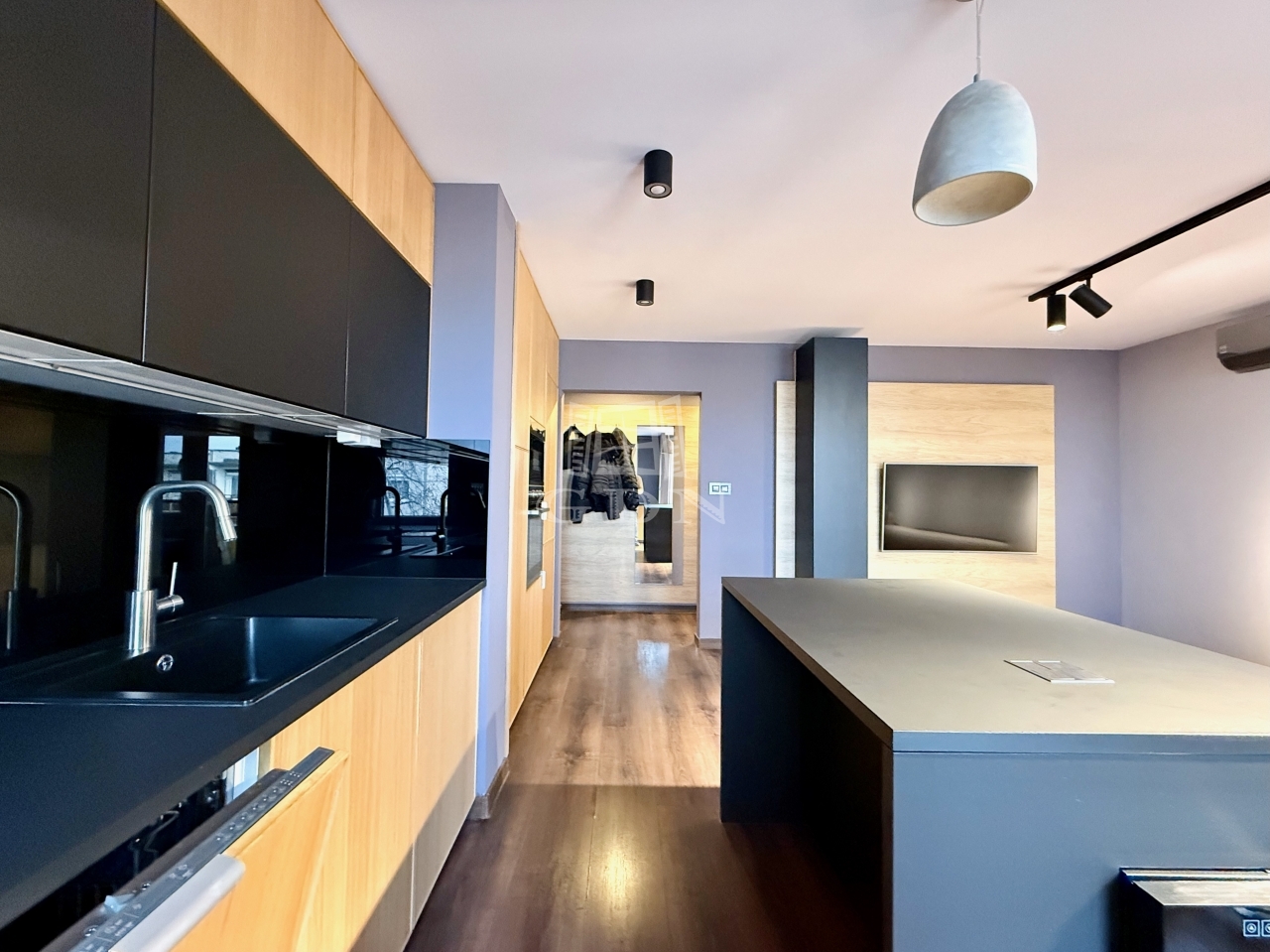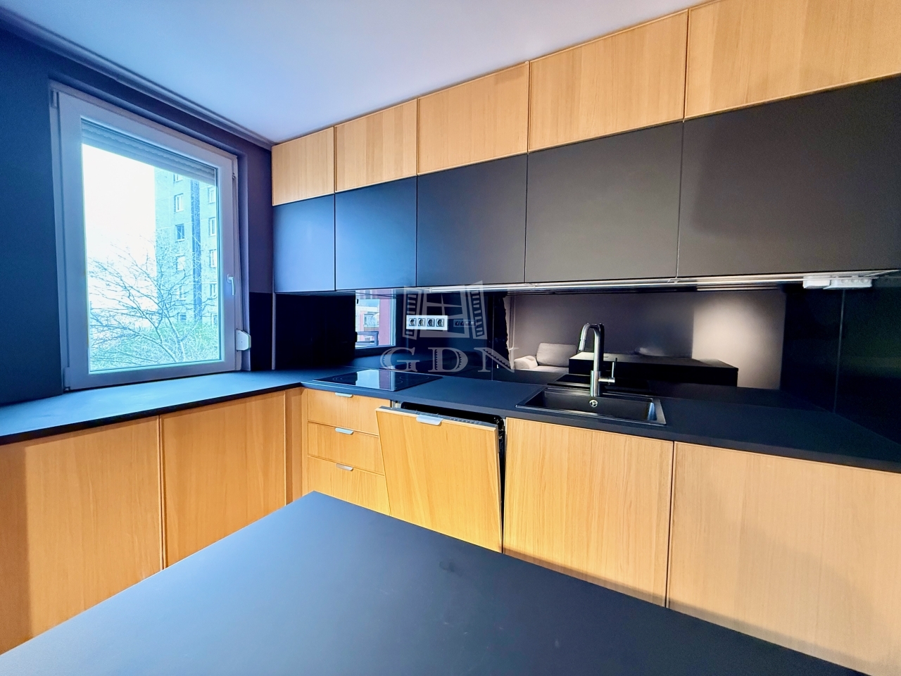 A nappali és a konyha egy légtérben kapott helyet, mégsem zsúfolt. A teljes falon futó konyhabútor, a nagy munkafelület és a szigetes kialakítás jól használható, mindennapi életteret ad. Innen közvetlenül elérhető az erkély, ami kényelmesen használható – akár egy gyors reggelihez, akár egy esti leüléshez.