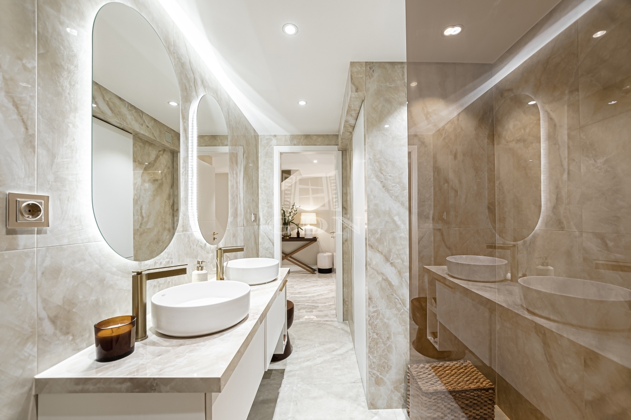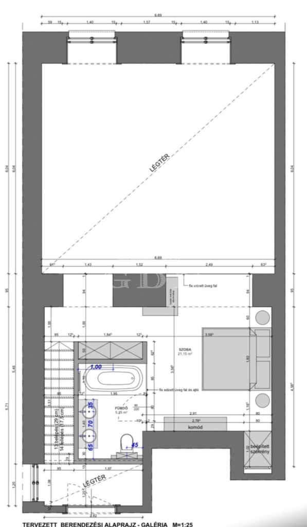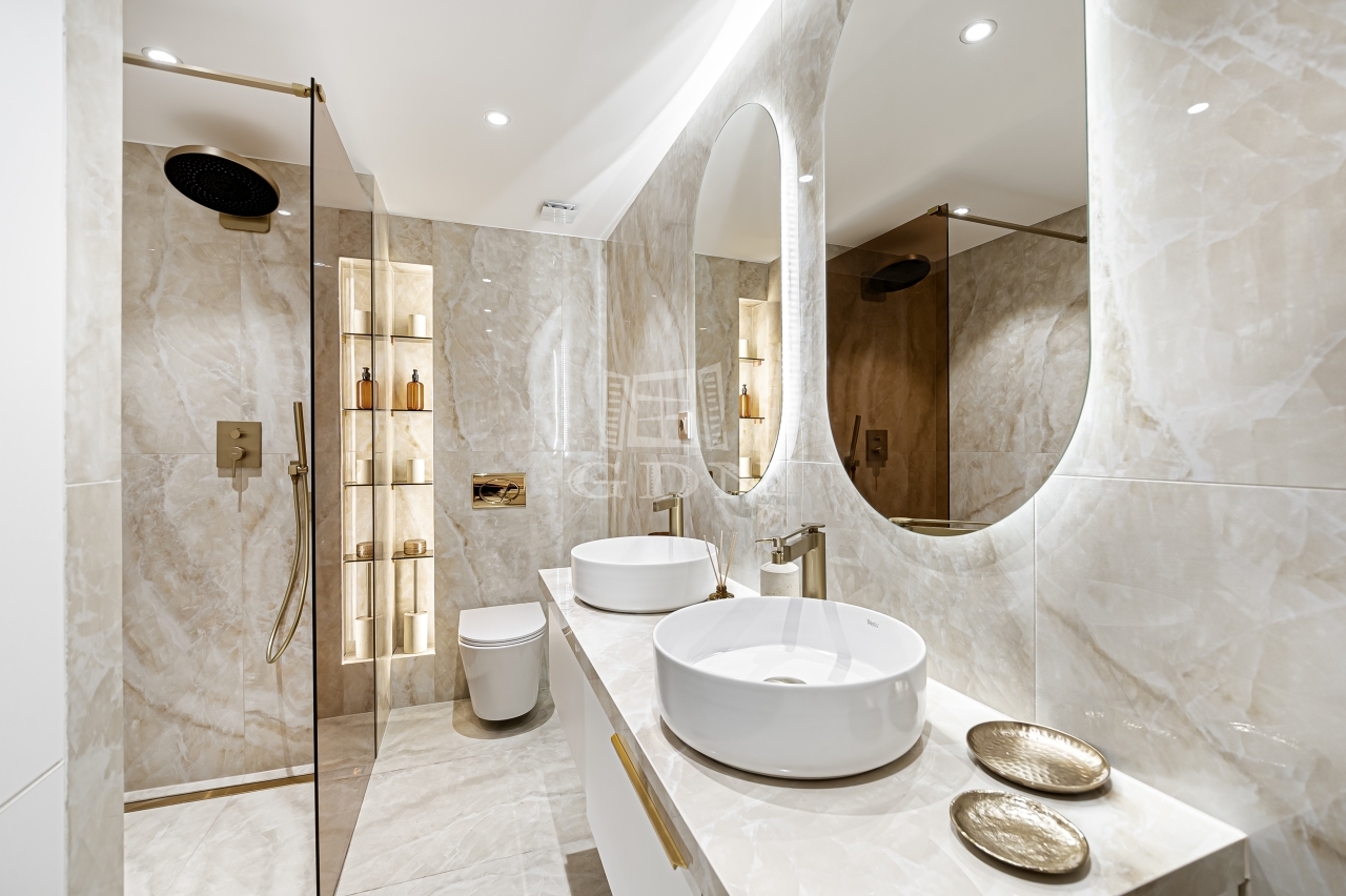 A két szintet 20 cm vastag vasbeton födém választja el, így a lakás nemcsak esztétikailag, hanem műszakilag is kifogástalan. A 4,65 méteres belmagasság tágas, levegős atmoszférát teremt, amelyet a gondosan megválasztott anyagok és színek tovább fokoznak.