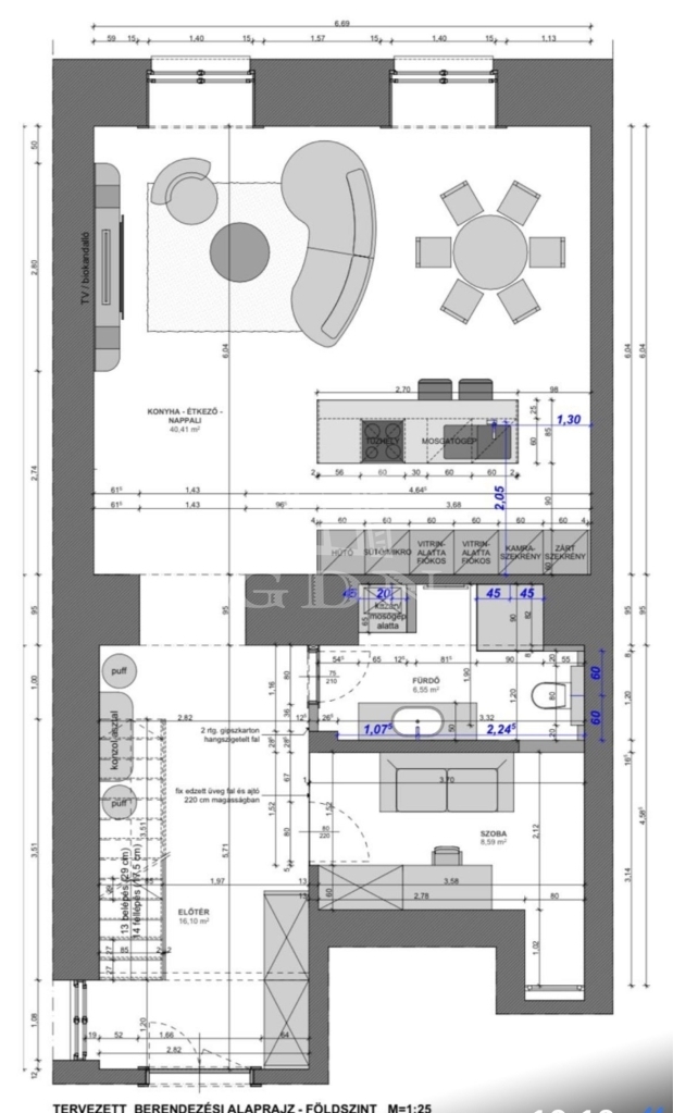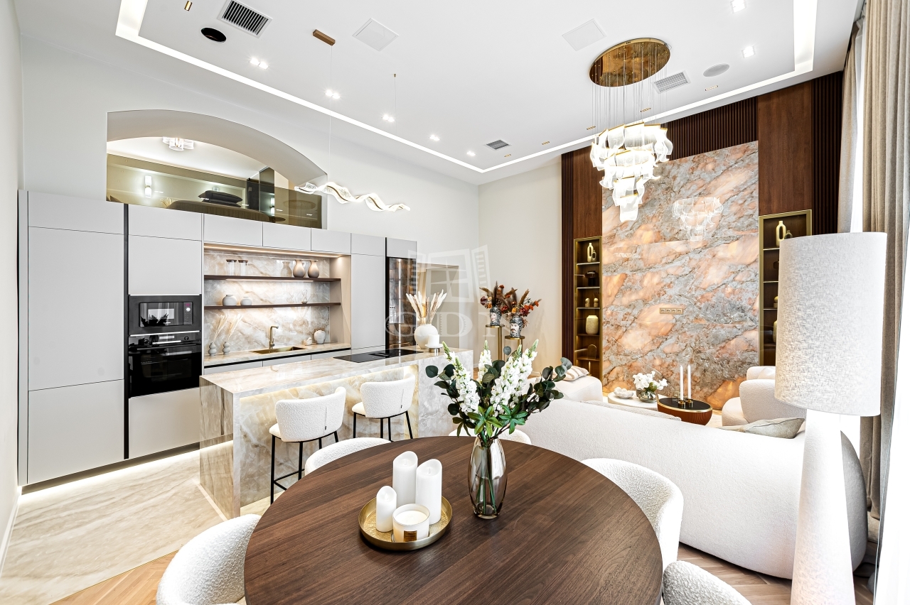 A nappali központi eleme a Scavolini konyha és a látványos médiafal, amely tökéletesen illeszkedik az otthon kifinomult stílusához.
