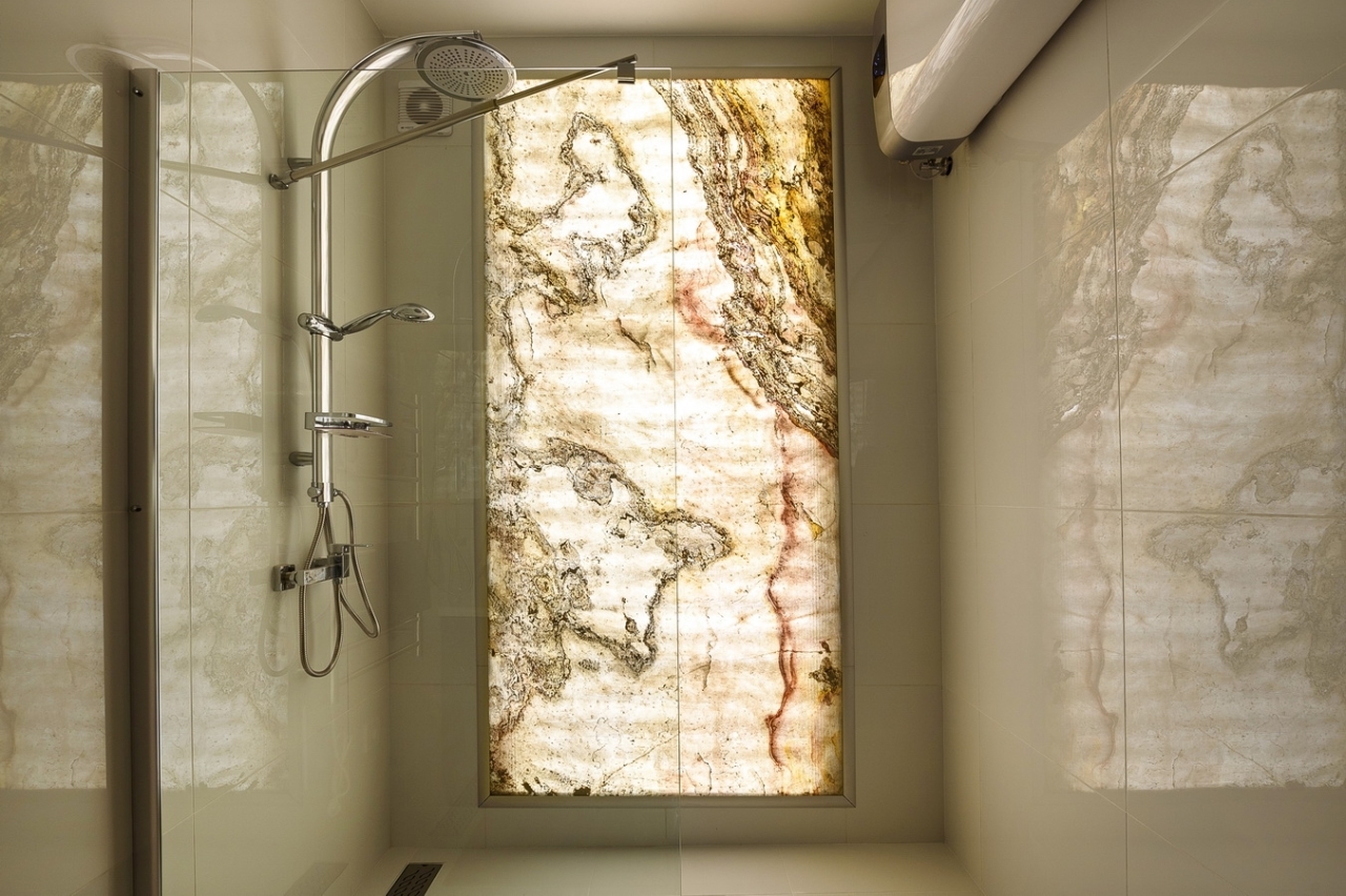 • Projektor és megvilágított slate light a fürdőben, elegáns részletek mindenhol