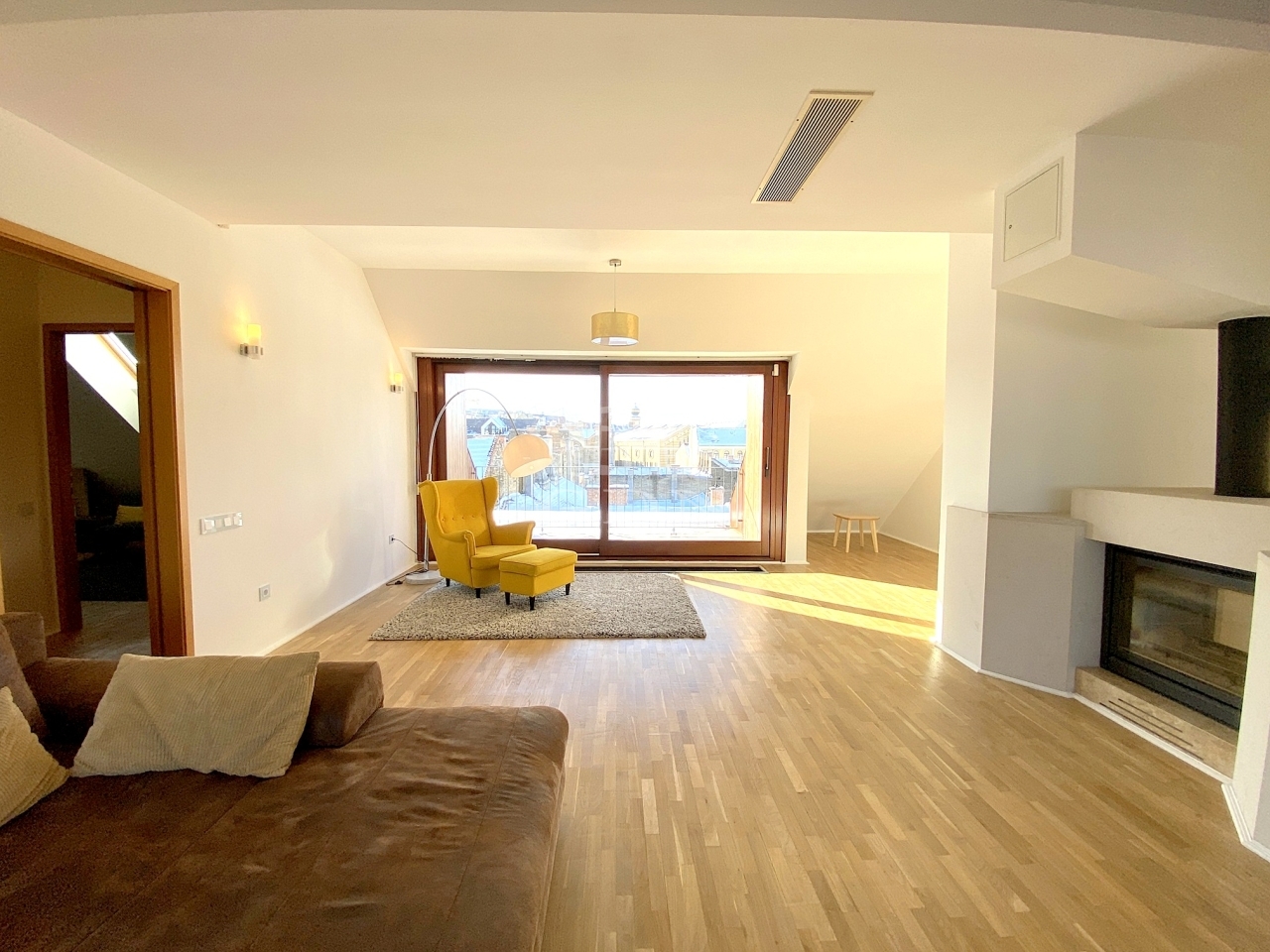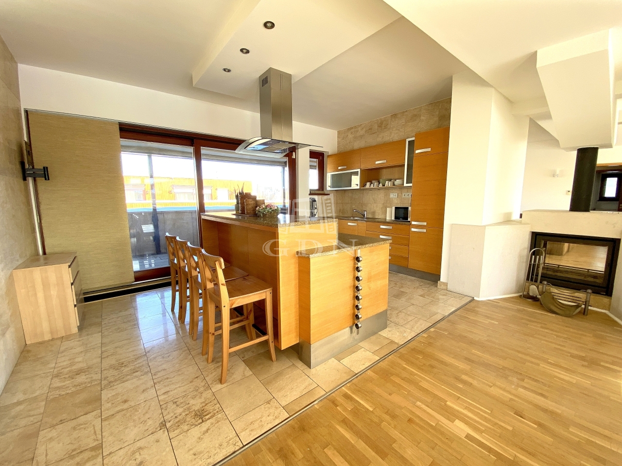 A lakás központjában egy fa tüzeléses kandalló kapott helyet.