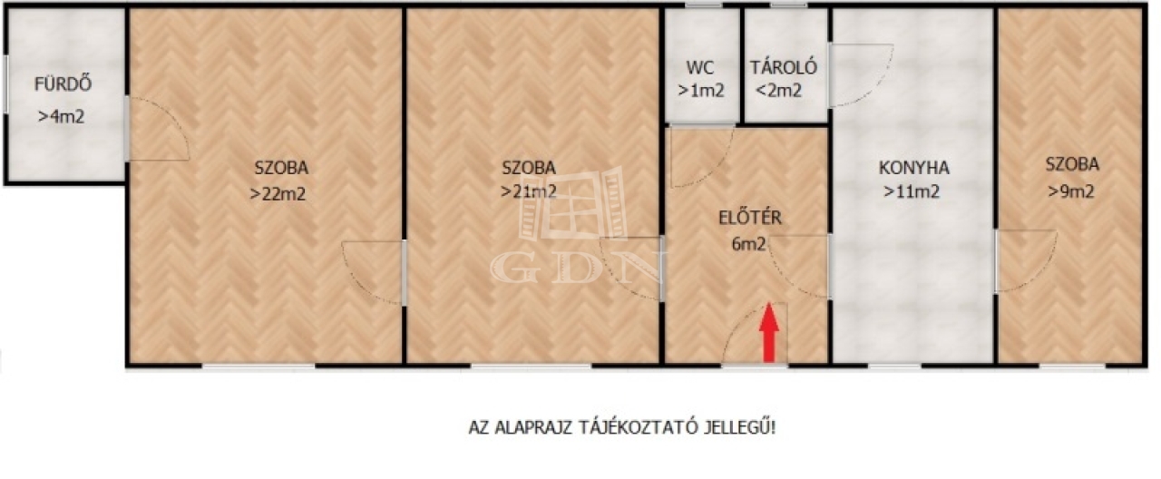 Ingatlan elosztása: szoba (22m2), szoba (21m2), szoba (9m2), konyha (11m2), kamra (2m2), fürdő (4m2), wc (1m2), előtér (6m2)