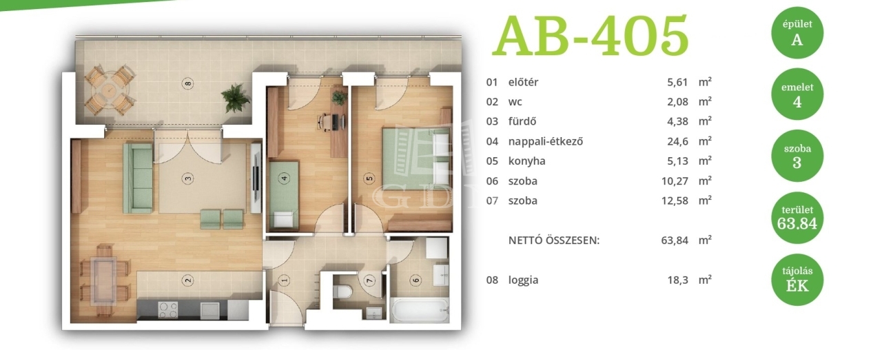 Ez a lakás nappali+2 hálós, 64nm alapterületű és tartozik hozzá egy 18nm-es terasz is.