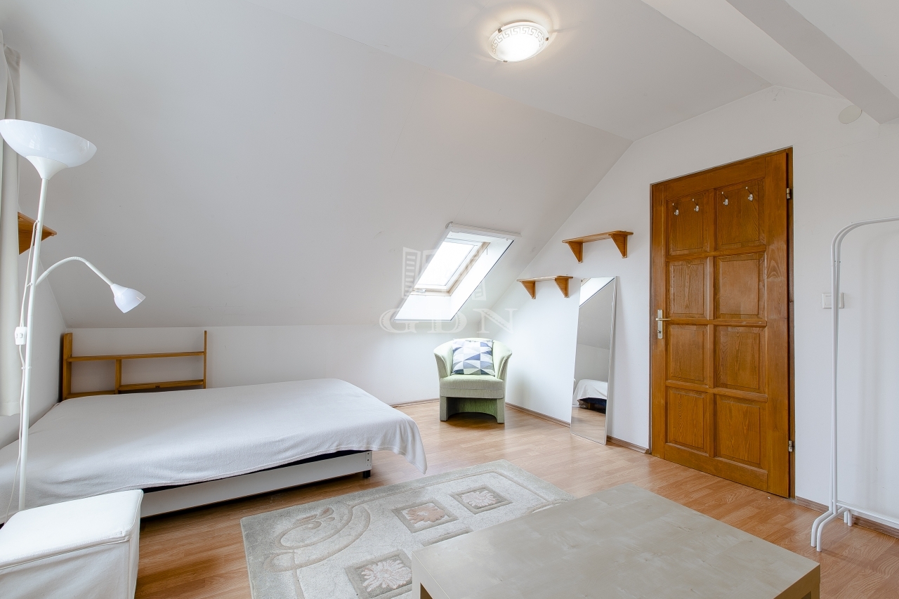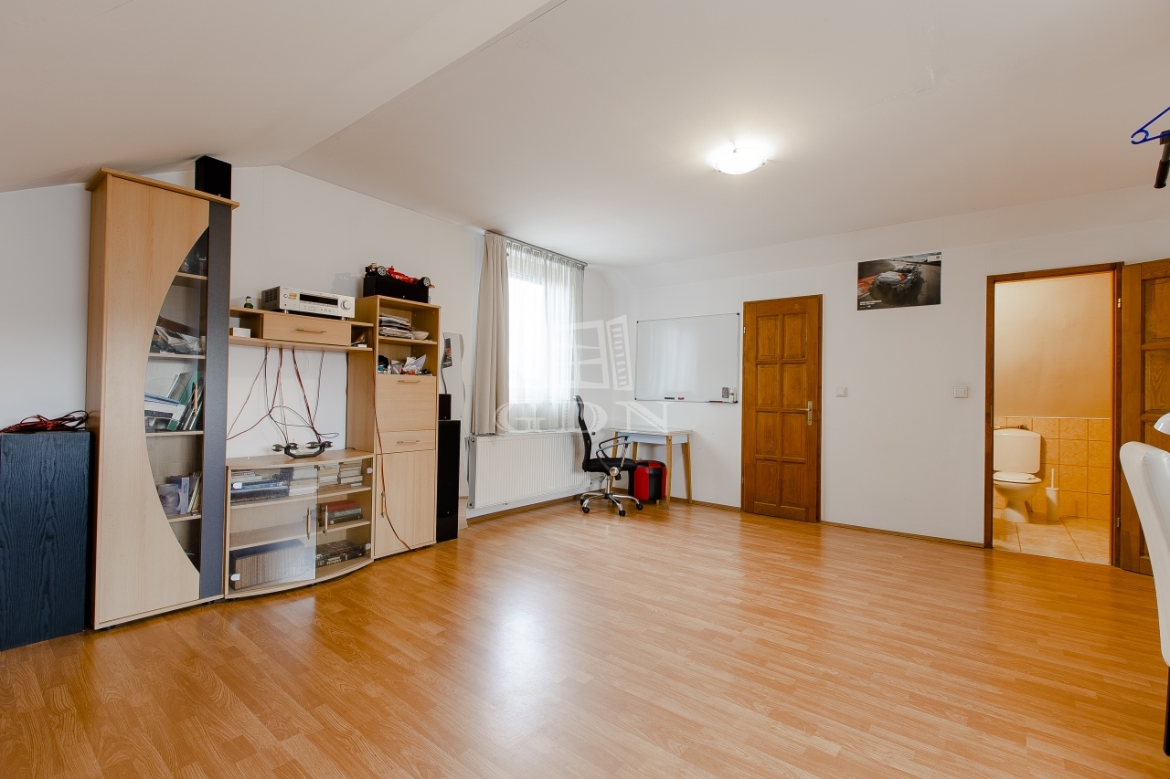 Szintén a közlekedőből jutunk fel a beépített teljes értékű tetőtérbe, ahol ki lett alakítva 2 db külön nyíló szoba, gardrób helyiség és egy zuhanyzós fürdőszoba. A nagyszoba további lehetőségeket rejt magába, szinte bárhogy lehet alakítani, akár 2 db szobává is.