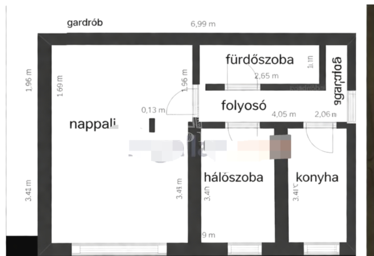 Elosztás: előszoba, gardrób, nappali, hálószoba, étkezős konyha, fürdő + külön WC
