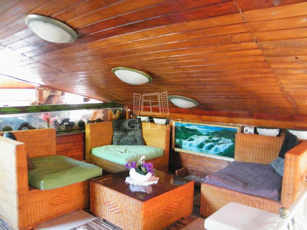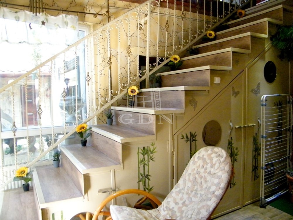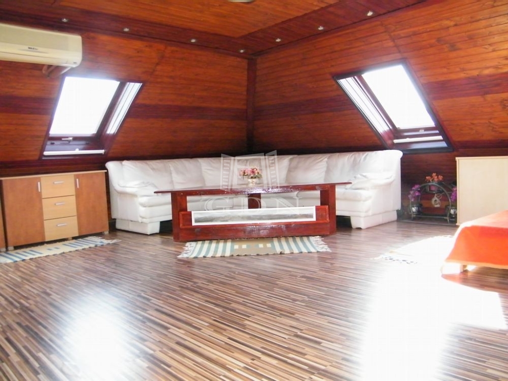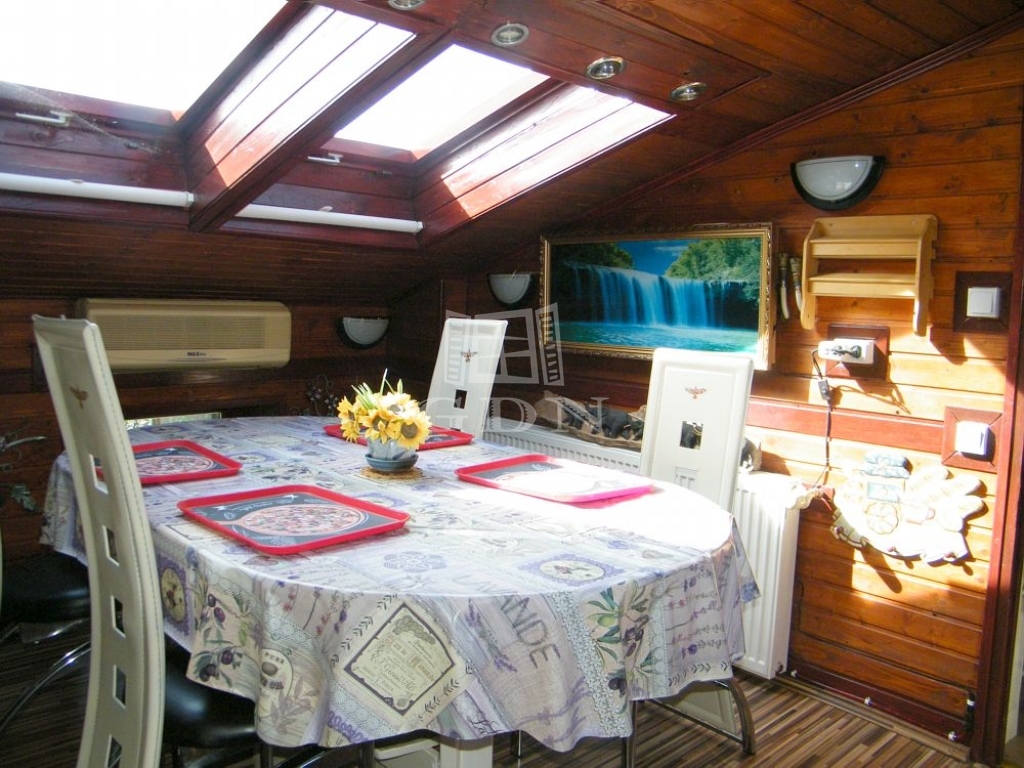 A beépített tetőtérben egy légtérben, de egymástól szeparáltan van a nappali, étkező, és konyha valamint fürdőszoba.