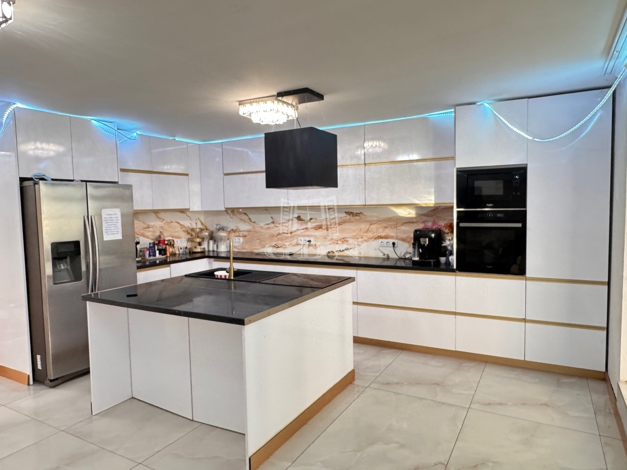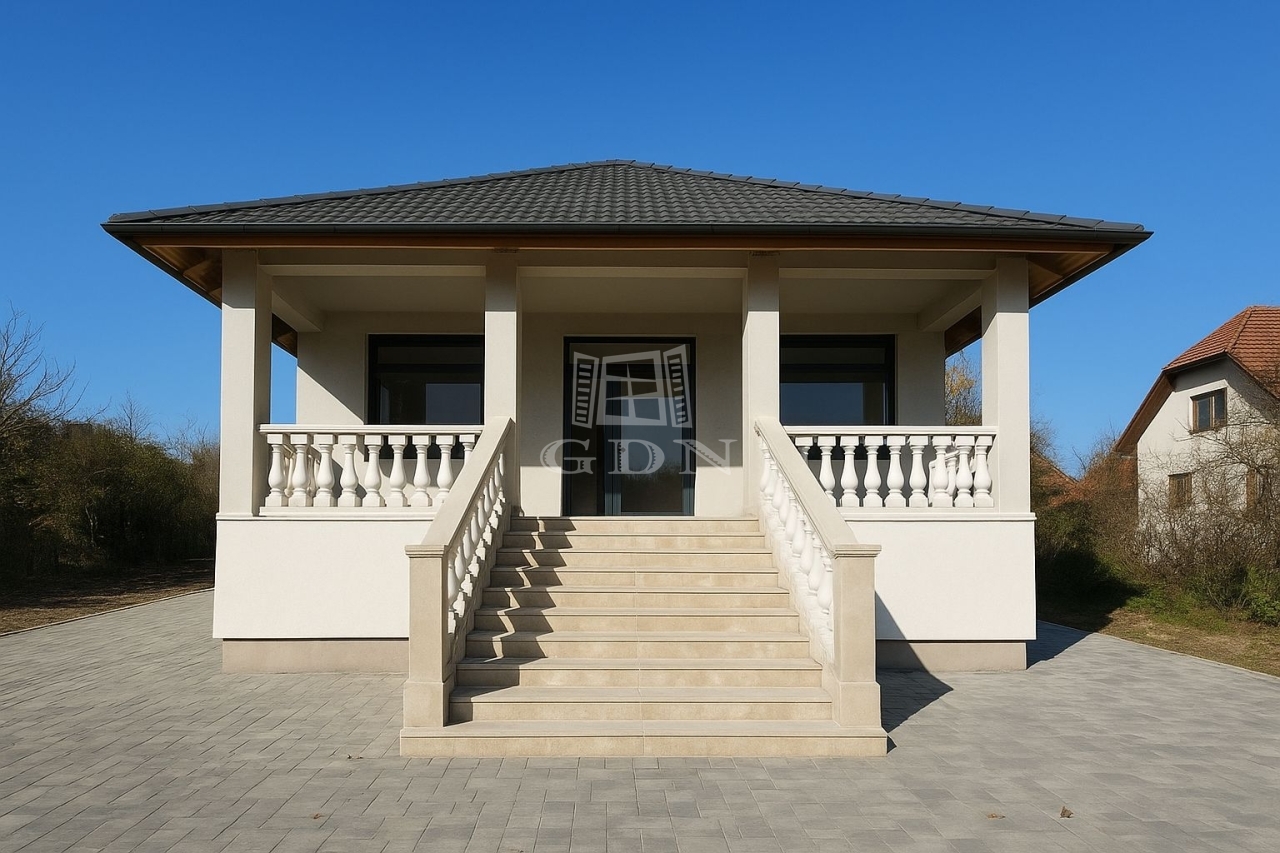 A ház alatti alsó szint 110 m2, ahol beépített konyha, kamra, kis szoba, zuhanyzós fürdőszoba WC-vel is kialakításra került, plusz egyéb tárolásra alkalmas terület is maradt.