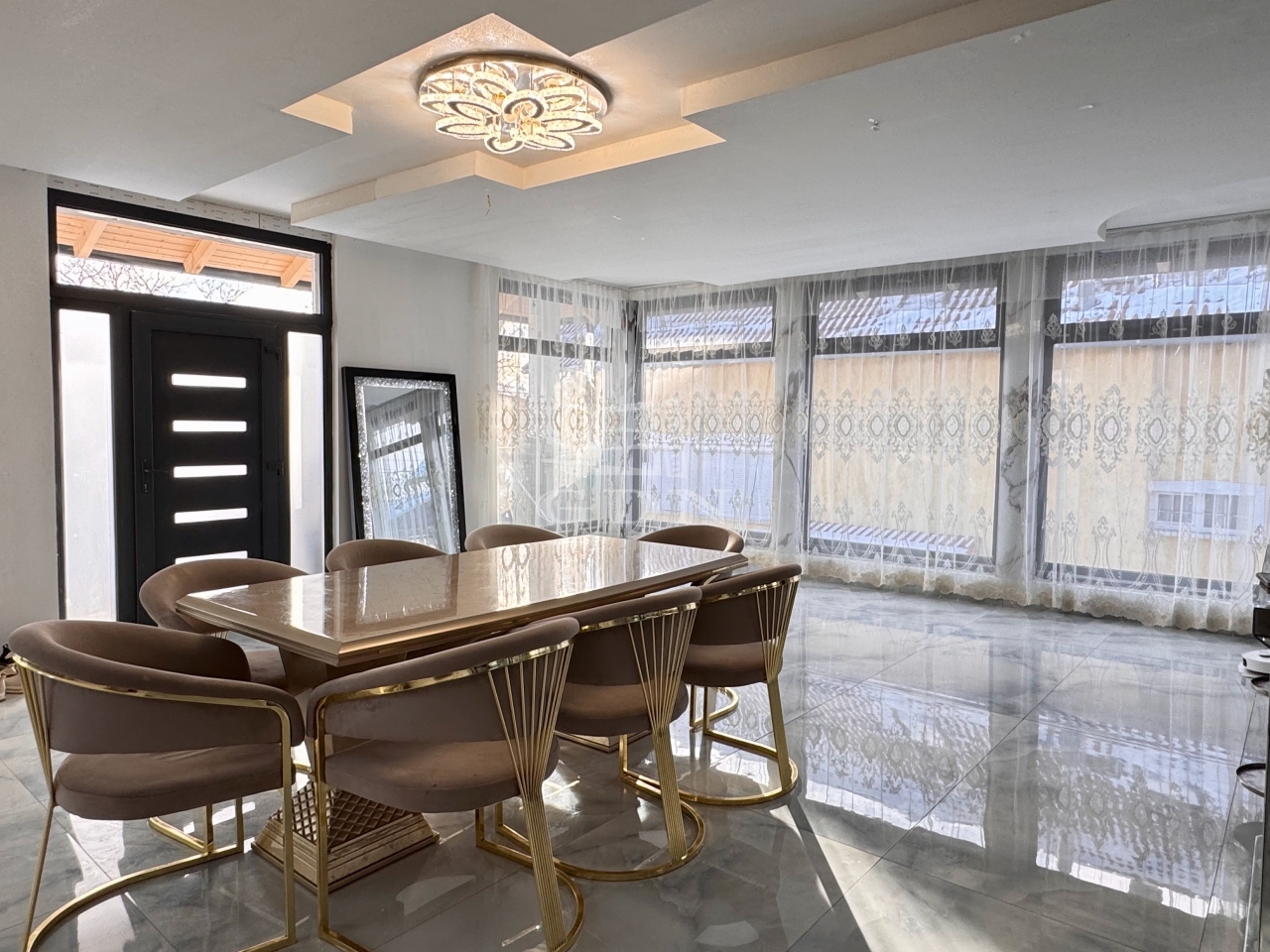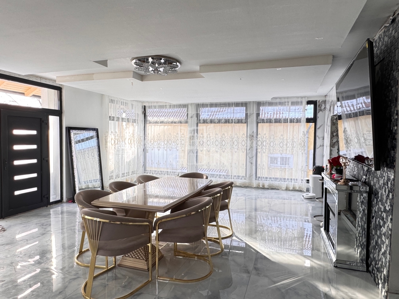 A házba belépve egy tágas nappaliba érkezünk, innen tovább haladva található egy étkezős - konyha, beépített modern konyhabútorral.