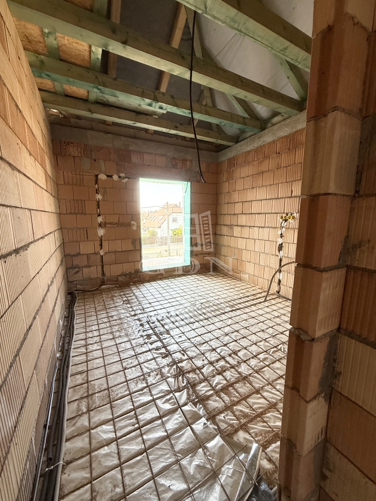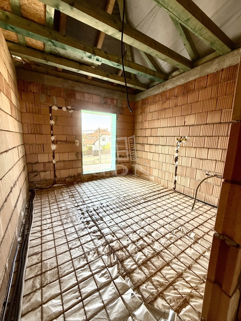 A képeken az emeleti lakás látható, ami külön lépcsőházból megközelíthető. A telek két utcára nyílik, így a két lakás és a hozzájuk tartozó telekrész is külön utcáról bejáratos.