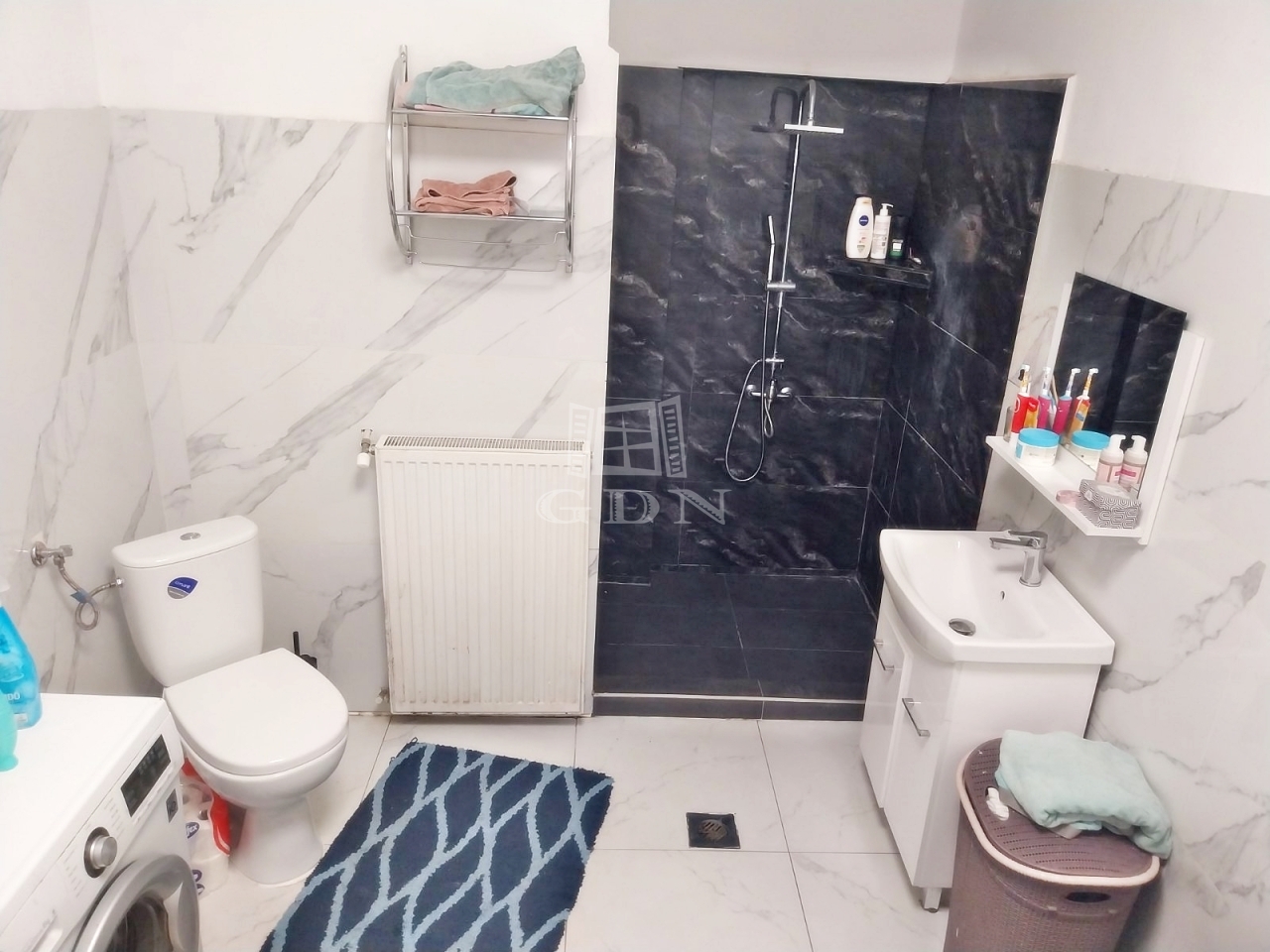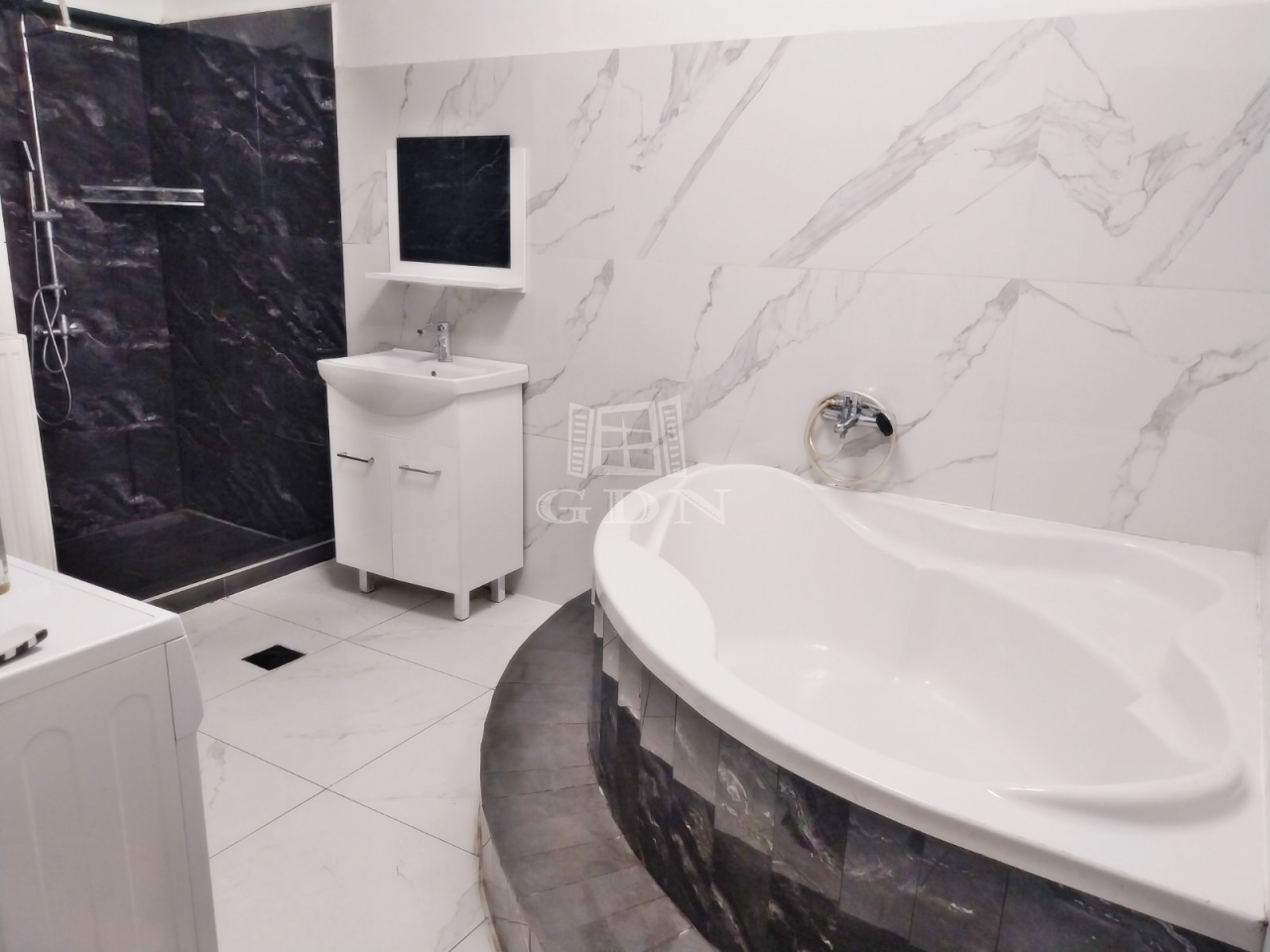 Kényelmes méretű fürdőszobája nagy sarokkádal és épített zuhanyzóval is rendelkezik emelve a komfort érzetet.