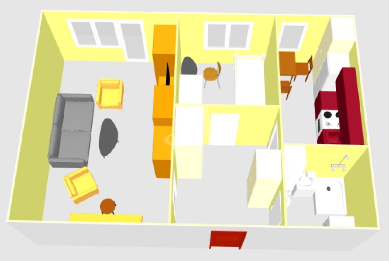 - Helyiségei: előszoba, 2 külön nyíló szoba, konyha, fürdőszoba + WC.