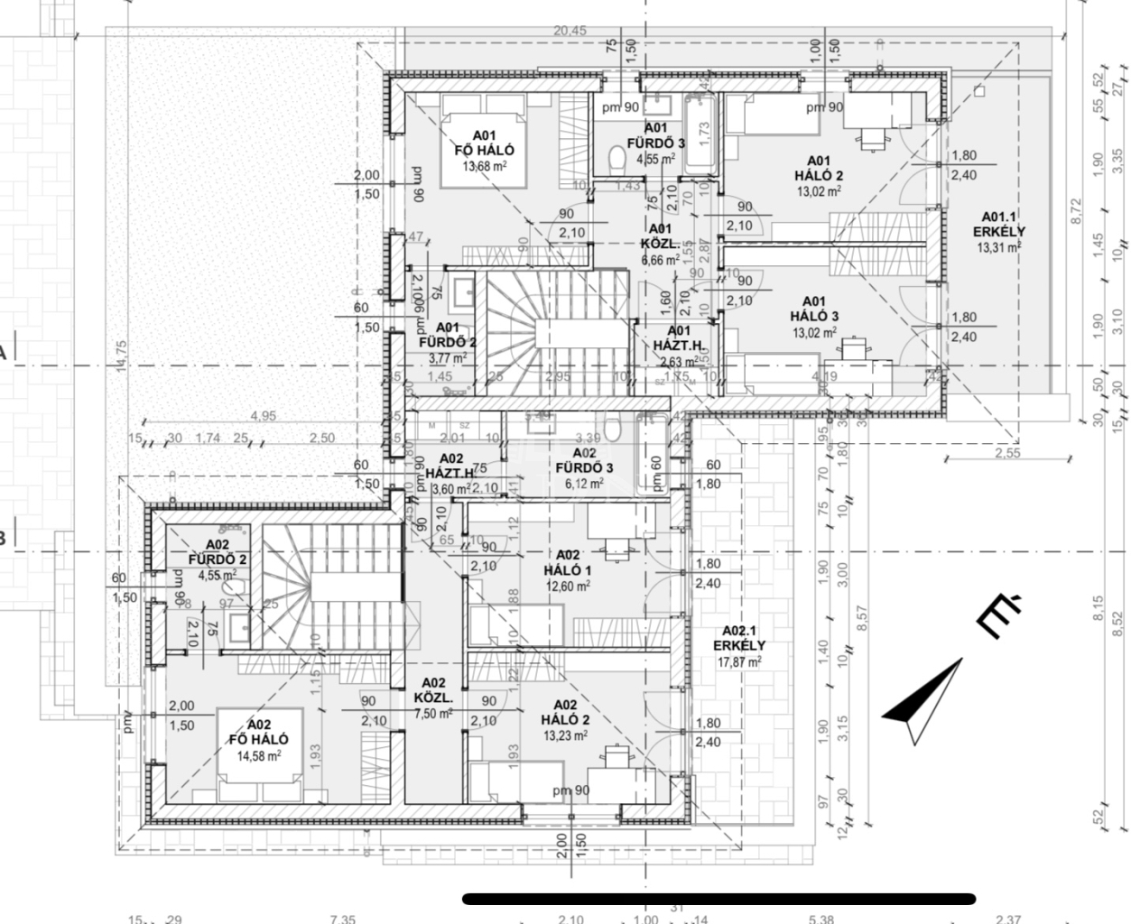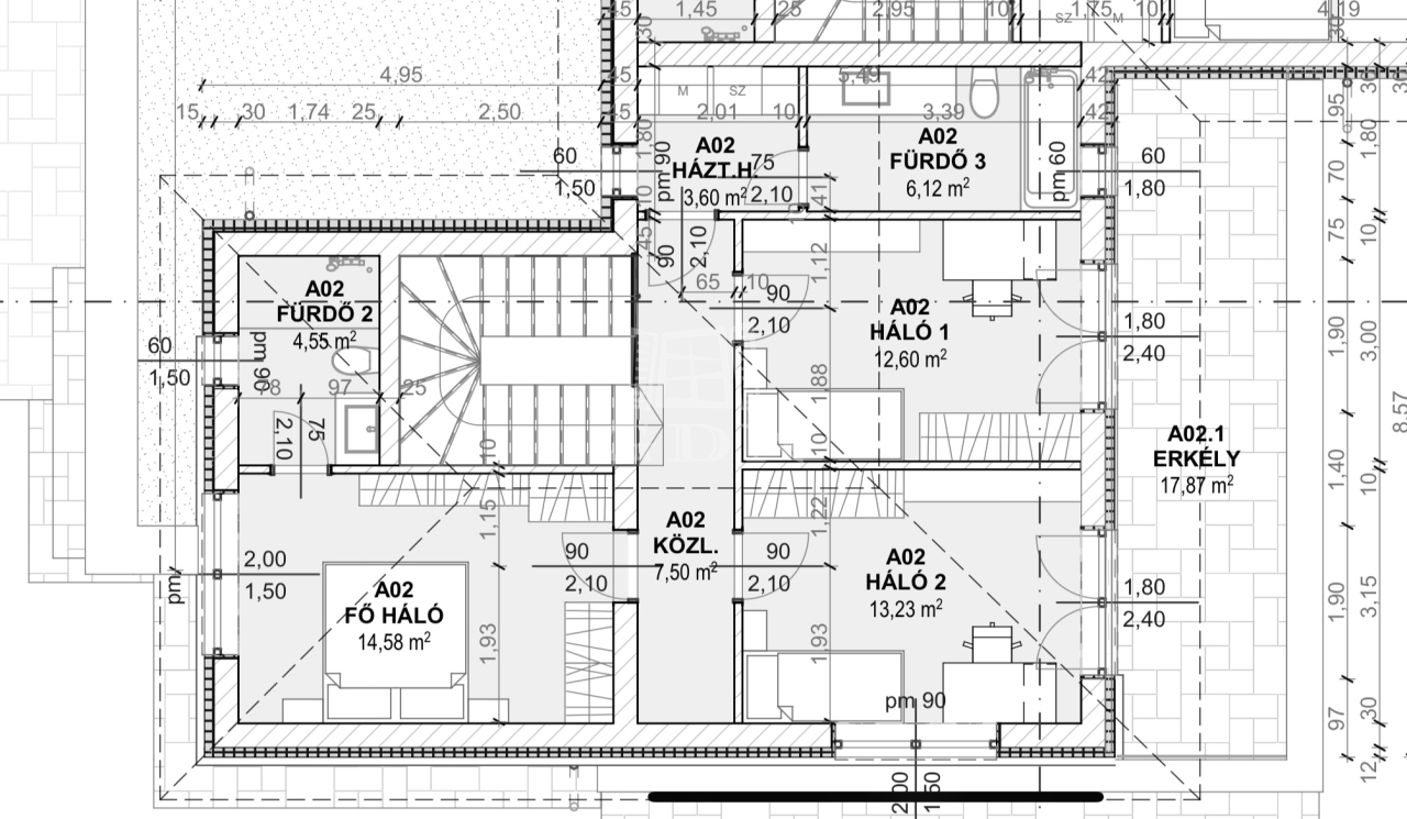 Az emeleti szint teljes egészében a pihenést szolgálja: négy hálószoba, három fürdőszoba, közlekedő és erkély biztosítja a kényelmes, jól szeparált privát életteret minden családtag számára.