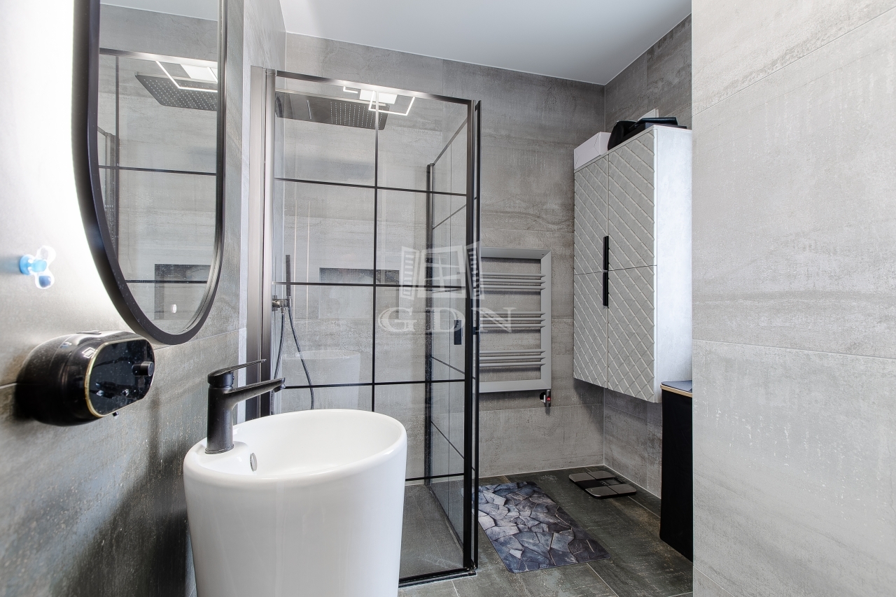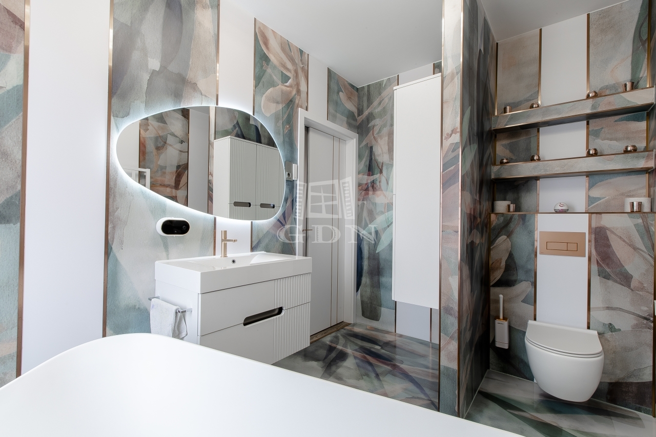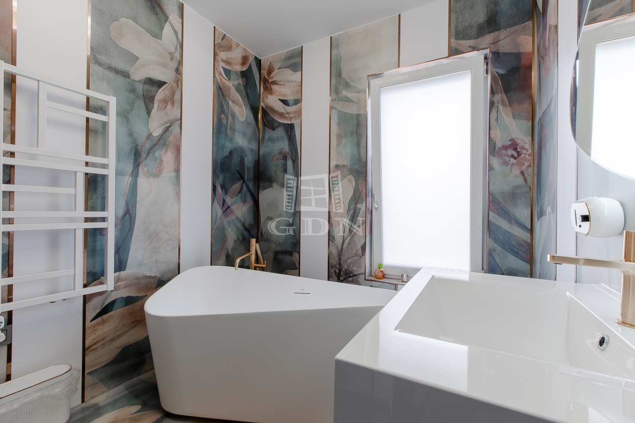 A tágas, világos nappali berendezve várja új tulajdonosát, a fürdőszobákban pedig felső kategóriás, bronz és rosegold színekben pompázó TRES csaptelepek és zuhanyok, valamint érintésmentes szappanadagolók és szemetesek szolgálják a kényelmet.