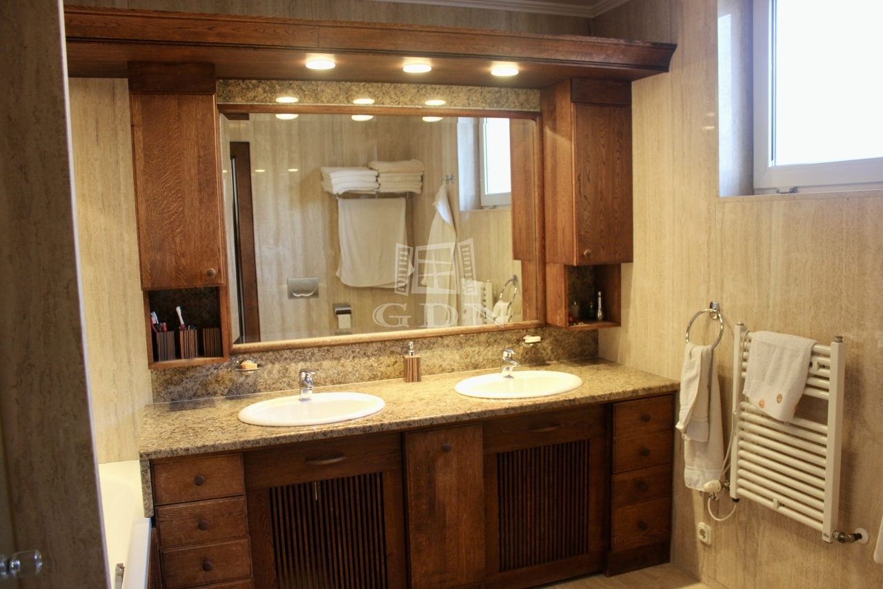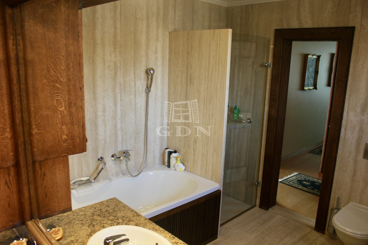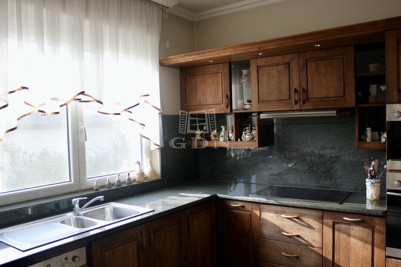 A ház belső tereit magas minőségű anyagok és megbízható műszaki megoldások jellemzik: a fürdőszobákban Laufen szaniterek, a közlekedőkben és vizes helyiségekben gránit burkolatok, míg a szobákban parketta és laminált padló található. A tölgyfából készült beltéri ajtók, a konyhabútor, a lépcső és a beépített gardróbszekrények egyedi kivitelezésűek. A földszinti nappaliban beépített kandalló és stílusos bárszekrény pedig tovább erősíti az otthon meleg, elegáns hangulatát.