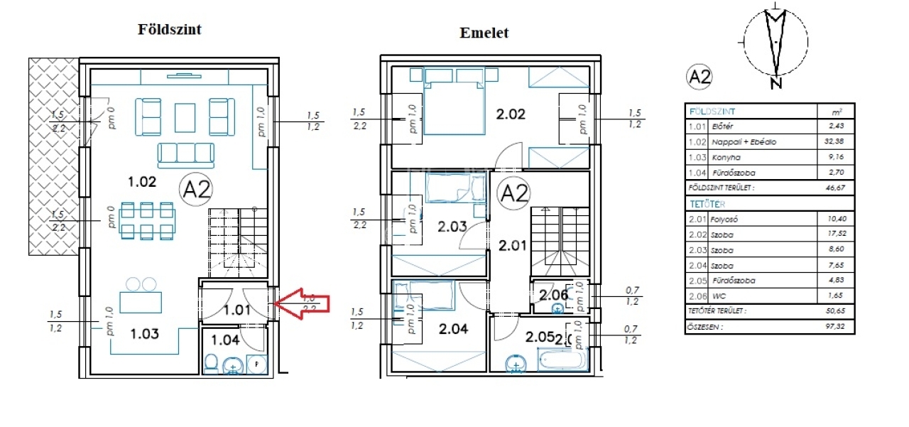 -emeleten:3db hálószoba, fürdőszoba-wc