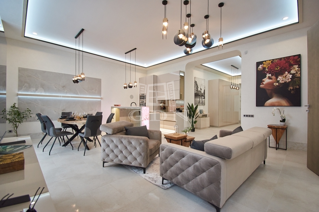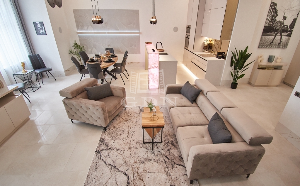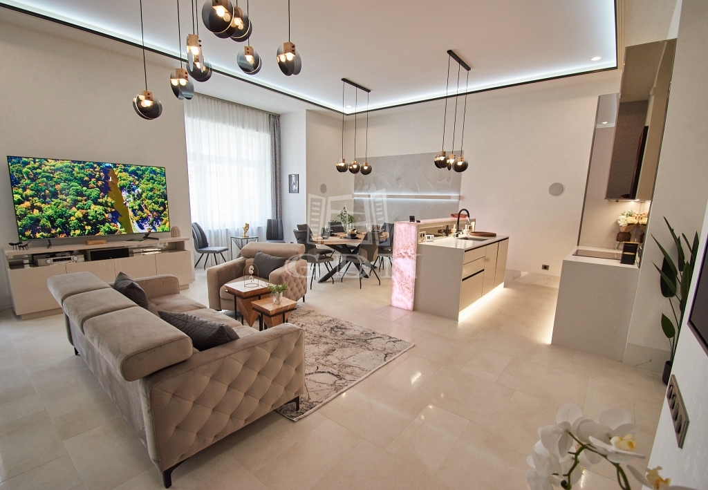 V. kerületben, a belváros szívében, eladásra kínálunk egy 100 m2-es (valóságban 107 m2), 3 szobás (2 háló + amerikai konyhás nappali), dupla komfortos, egyedien és PRÉMIUM minőségben felújított EXKLUZÍV, LUXUS lakást.