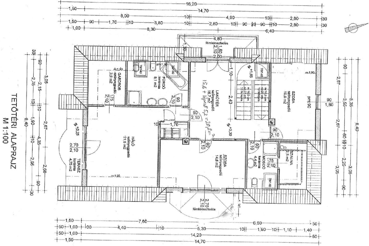 Hasznos nettó lakóterülete ( földszint 92,7 m² + tetőtér 88,4 m² ) összesen: 181,1 m².