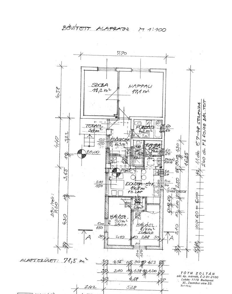 -előszoba(6,4m2), fürdőszoba(4,2m2), WC+kézmosó(4,1m2), nappali(17,1m2), hálószoba(11,2m2), konyha+étkező(14,8m2), kamra(2,1m2), közlekedő(1,4m2), 2 szoba(8,4m2, 9m2).