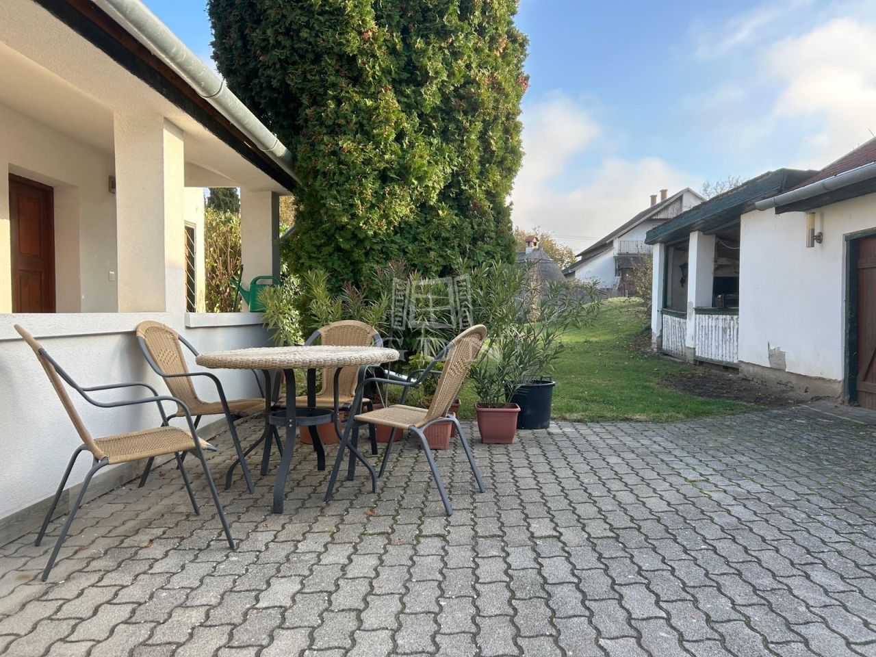 A ház 37 m2-es nappali-étkező, előszoba-étkező, konyha, fürdőszoba, wc, közlekedő helyiségekből áll. További hálószoba leválasztással kialakítható, illetve a verandáról nyíló jelenleg tároló funkciót ellátó helyiség is alkalmas lehet szoba kialakítására. Az épülethez csatlakozik egy tároló és egy 20 m2-es terasz, illetve a ház mellett található egy külön épület, fedett kiülő és pince. A kert gondozott, öntözése ásott kútból lehetséges. Ár: 79 MFt