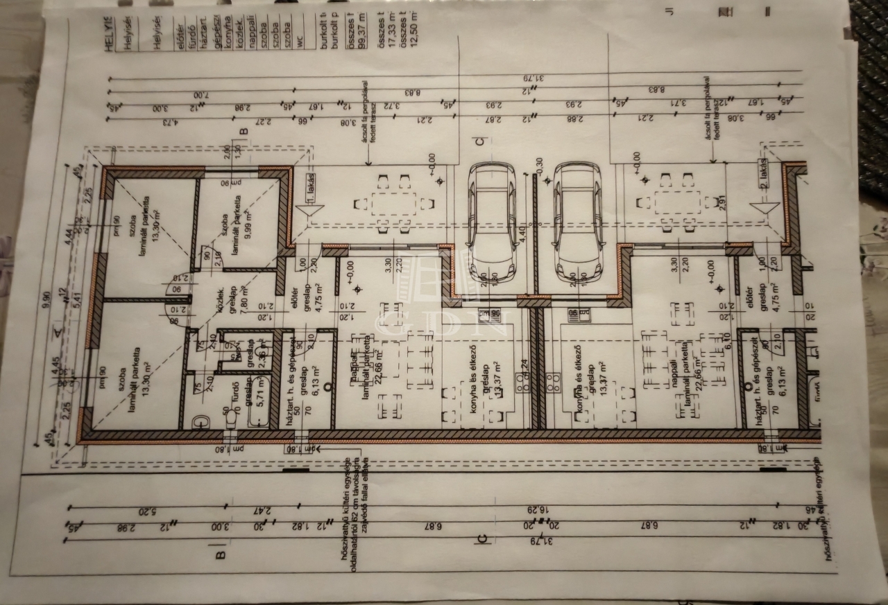Fedett terasz:15m2 A lakás mérete 99,37 nm, a tervrajzon látható elosztásban. Egy lakás 532m2 telken helyezkedik el. Magas energia hatékonyságú A+ kategóriás lakás, fali és padlózati hőszivattyús fűtés és klíma berendezéssel ellátva. Áramellátás 3×16A, víz és csatorna ellátás központi rendszerhez csatlakozik. Természetesen a hideg, meleg burkolatok, a beltéri ajtók és a szaniterek egy meghatározott kereten belül még választhatóak.