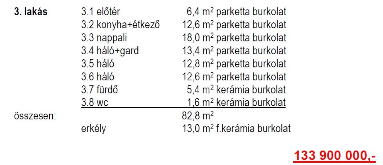 A lakás alaprajza és a helységek listája a képek között megtalálható.