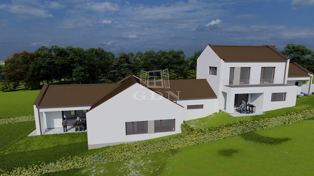 Veresegyház, Hegyek városrész csendes, kertvárosias részén, cca. 650 nm-es telek területtel, Új építésű, bruttó 176 nm-es, 5 szobás (nappali + 4 hálószoba, külön konyha, étkező), egy szintes, vasbeton födémes, hőszivattyús (levegő - vízes) padló fűtéssel, Dél - Nyugati fekvésű, műanyag thermo dió színű (3 rétegű, 7 légkamrás) nyílászárós, szigetelt (15 cm dryvit), új építésű, a másik féltől teljesen elszaparált, dupla garázzsal elválasztott, a másik lakóegységgel egy telken lévő, de külön, elválasztott úton megközelíthető családi ház (hátsó) eladó.