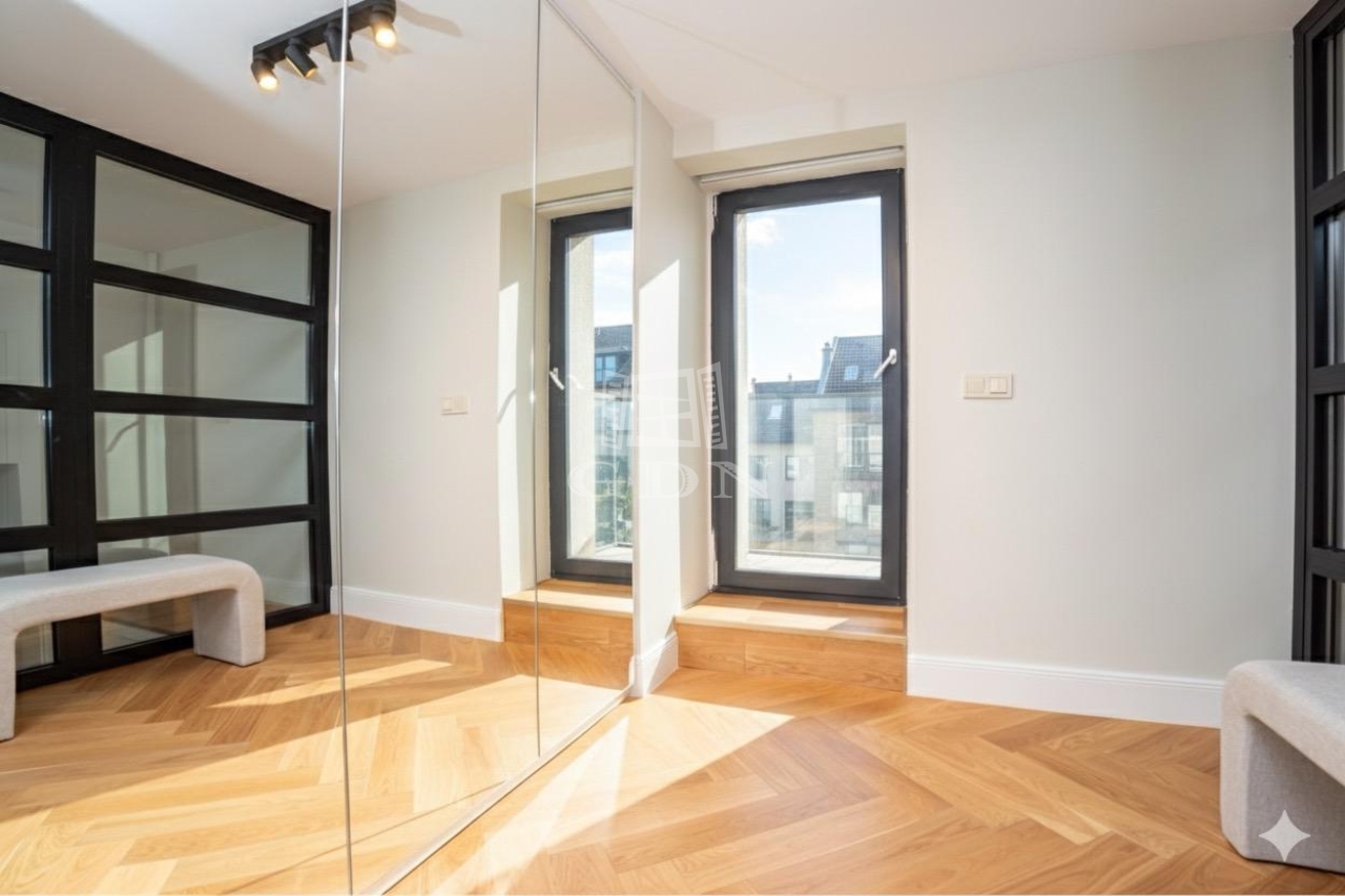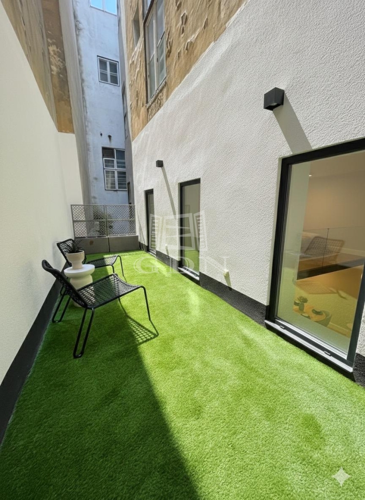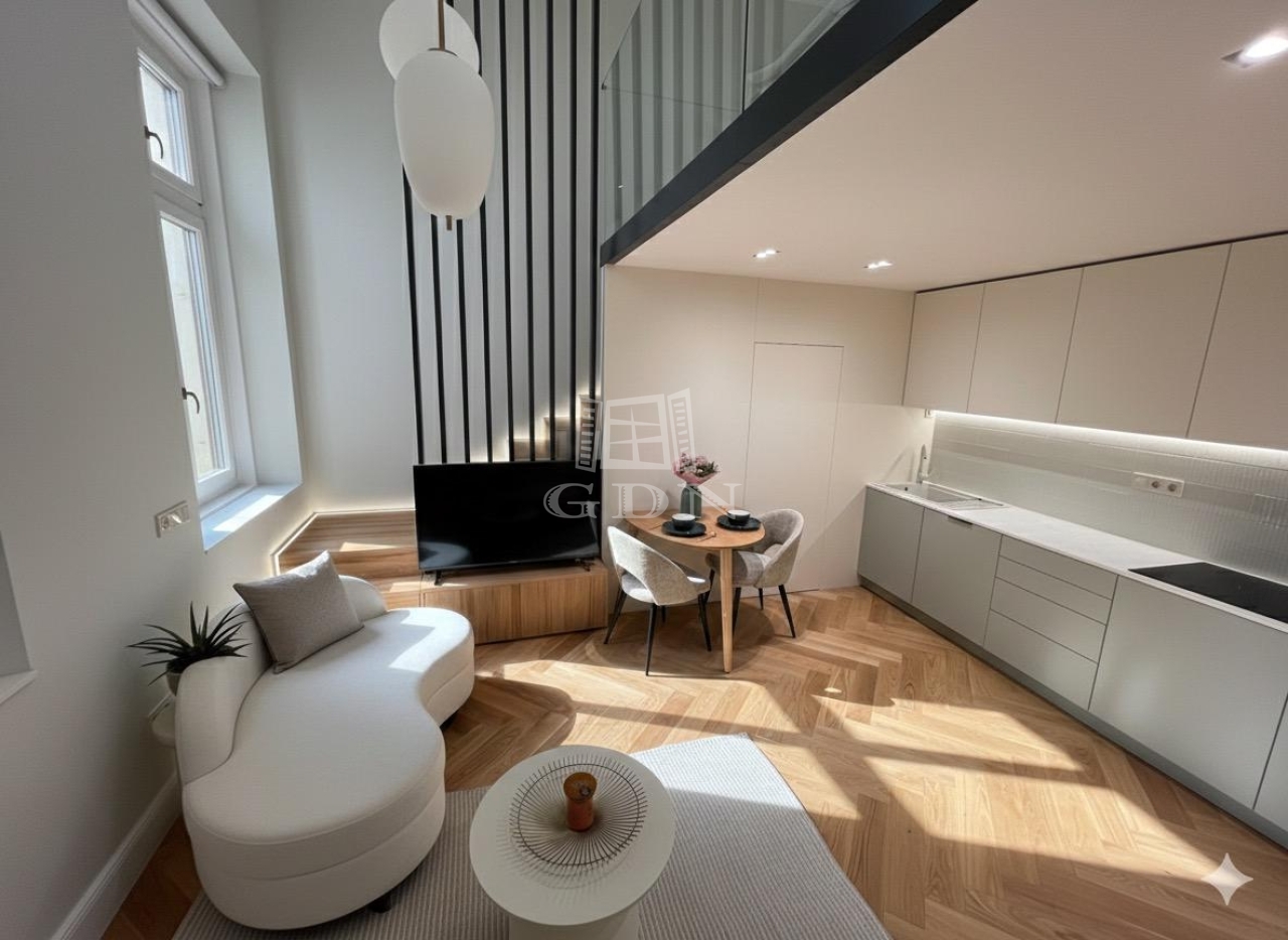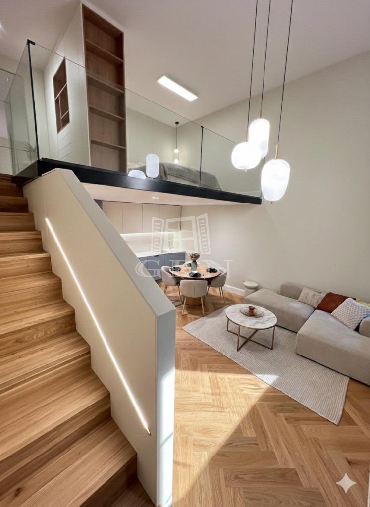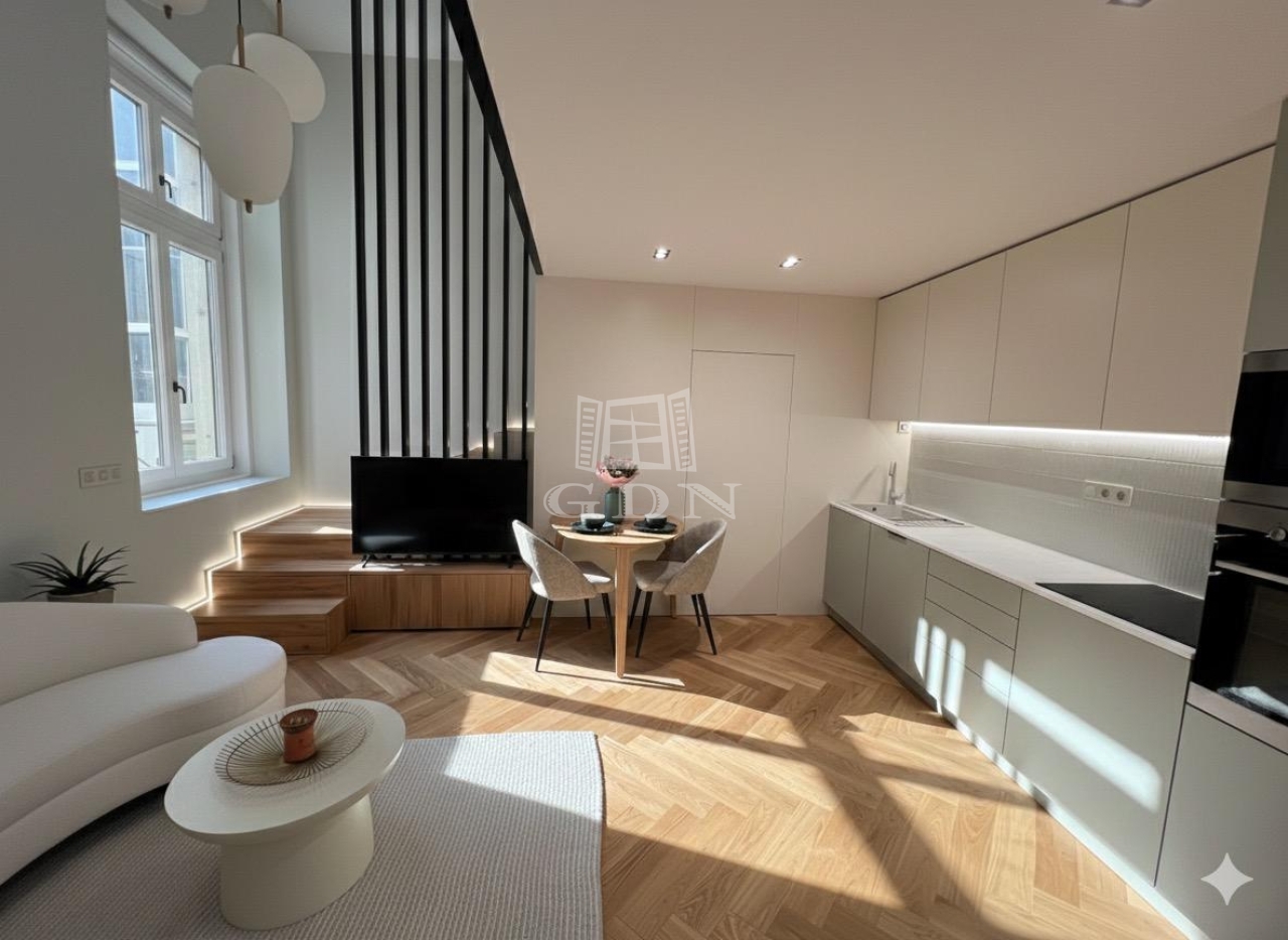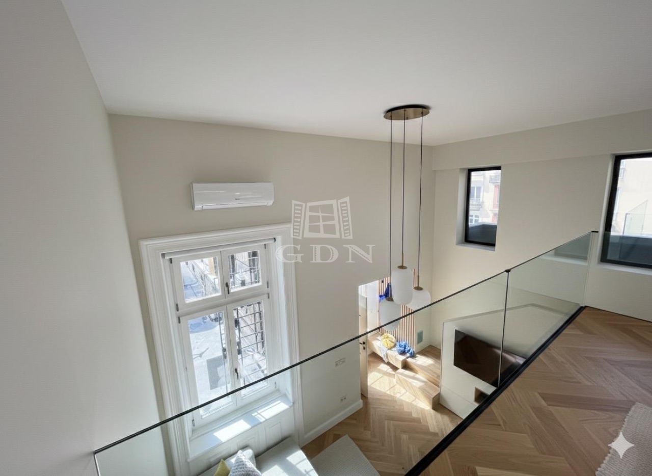 Ez a 104 m²-es, belső két szintes, galériás lakás a 13 m²-es teraszával /eredetileg Lichthof/ egyedülálló lehetőséget kínál a belvárosi élet és a csendes udvari elhelyezkedés kombinációját keresőknek.