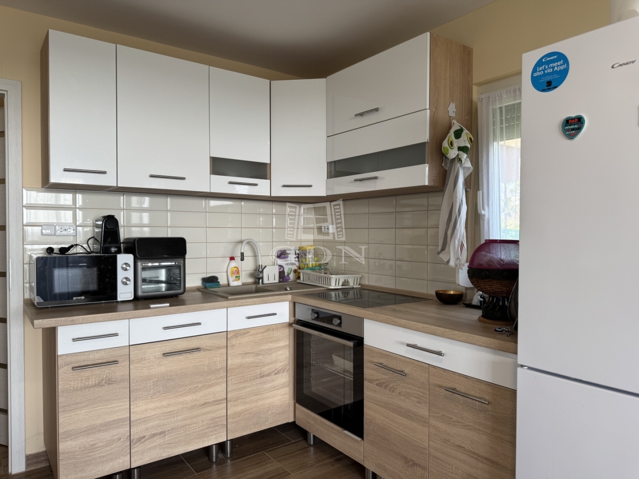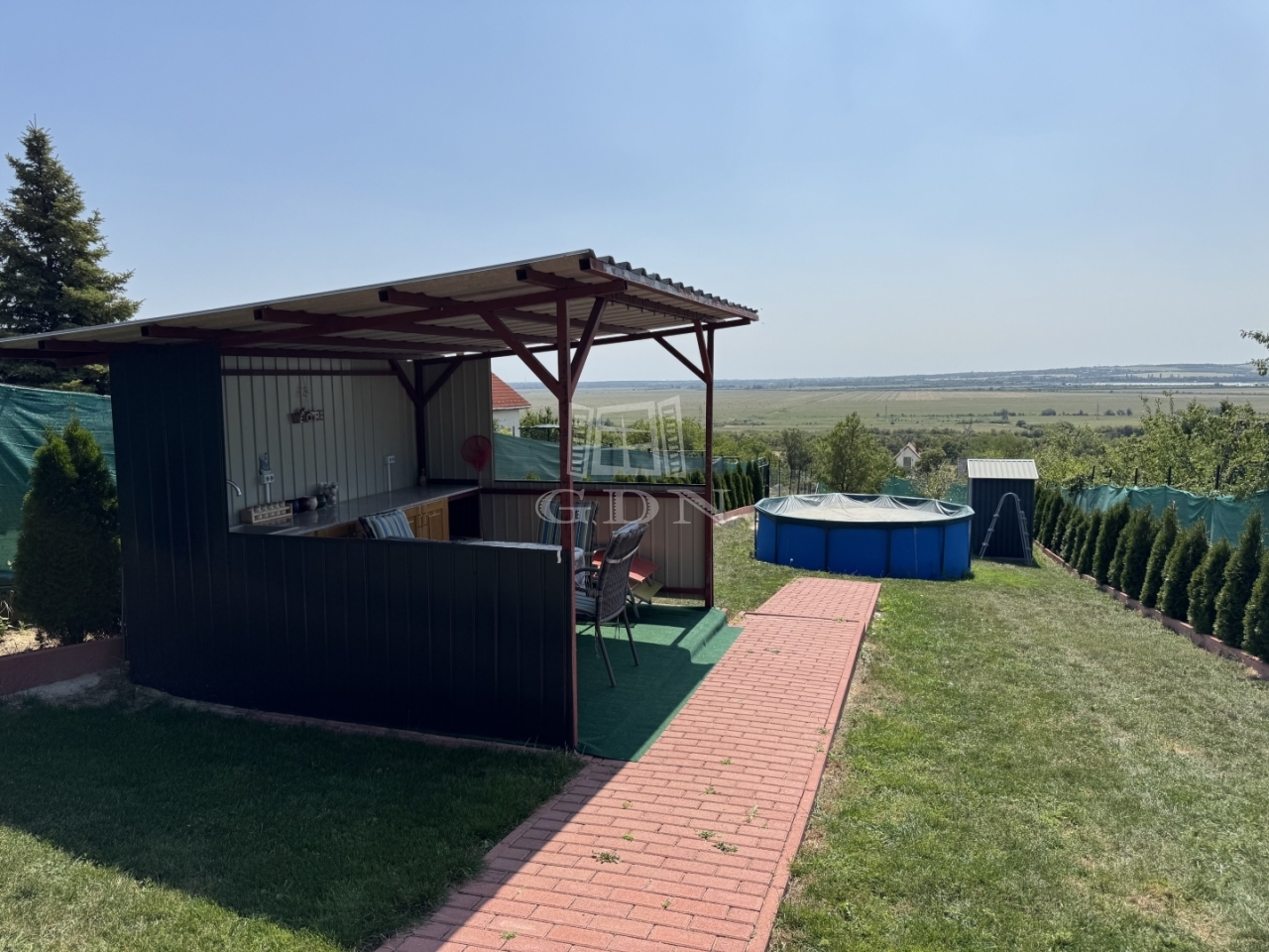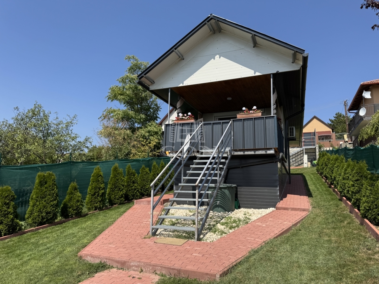 A telek 800m2, teljesen körbekerített, nagy része térkövezett és örökzöldekkel beültetett. Pergolás kültéri konyha áll rendelkezésre a kerti élményekhez.