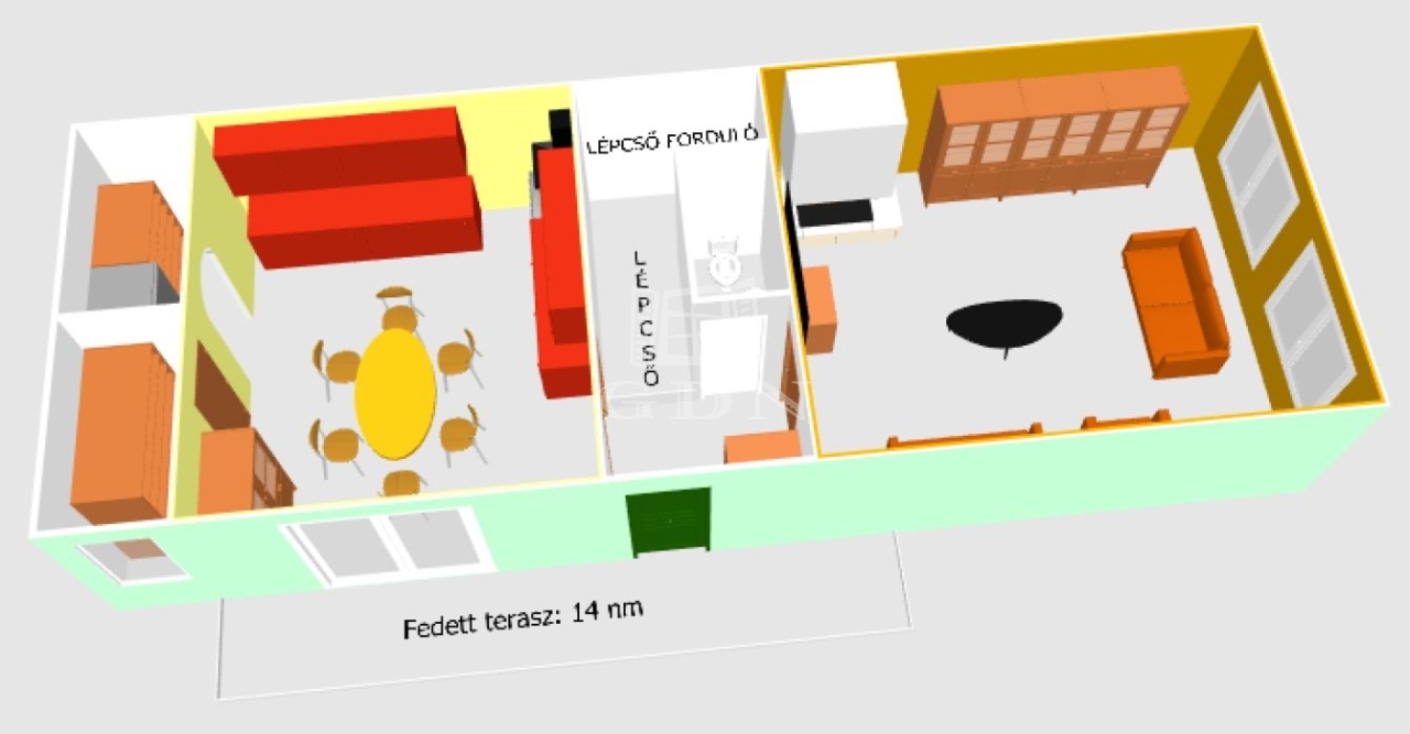 A fő épület hasznos alapterülete 192nm (+ 14nm fedett terasz) melyben található: