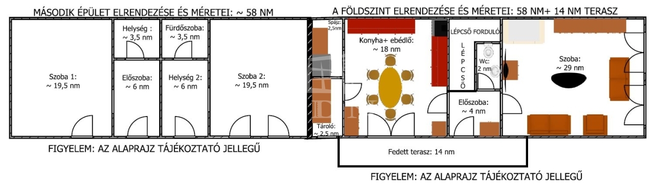Az egész épületben nagy méretű és szép igényes szobák (sok beépített bútor, klíma, szép falak, nagy terek....) jellemzik + több fürdő és wc is van számunkra. Hatalmas méretű ház, mely önmagában is több generáció számára alkalmas és még ott van mellette (egybeépítve) a második épület, ami még egy családnak elegendő.