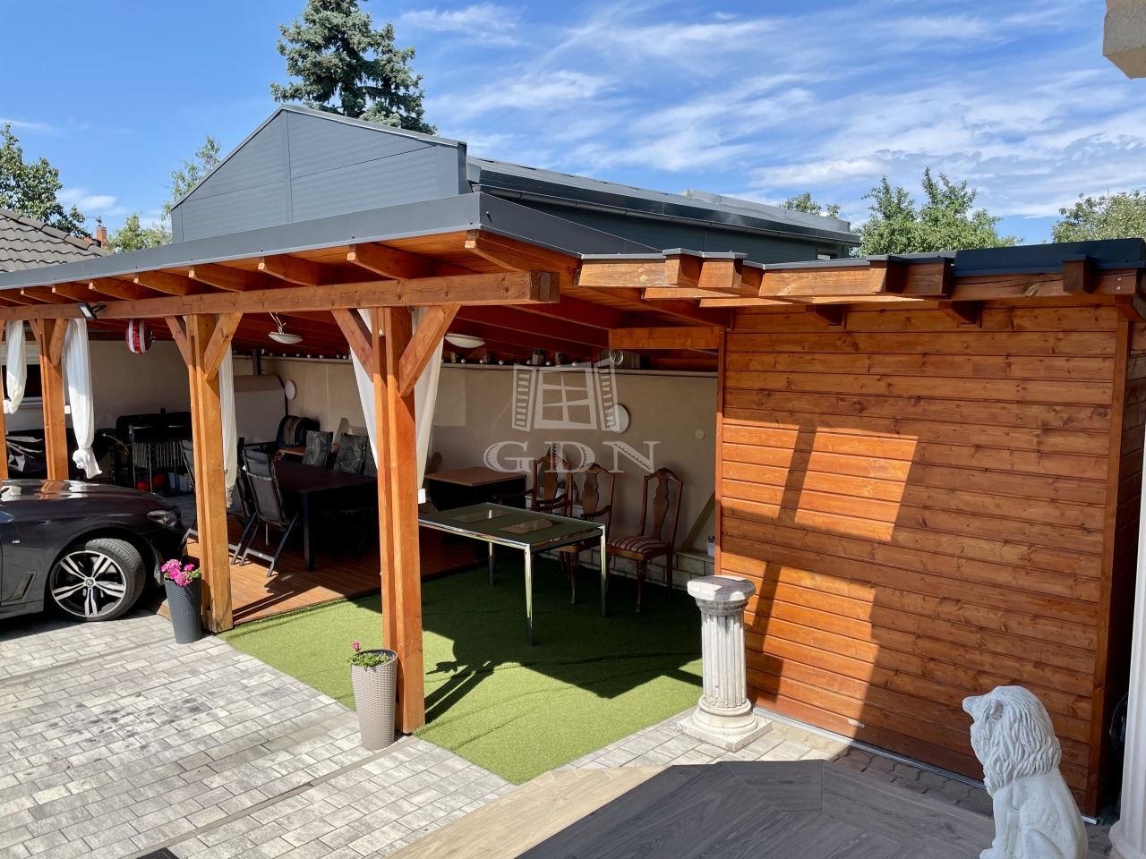 - A konyhából lehet kijutni a nagyobb (12 m2-es) teraszra, amin át megközelíthető az udvar hátsó része: a plusz gépkocsibeállók, a garázs a kisebb épülettel, illetve a nagyméretű, minden igényt kielégítő nyári konyha.