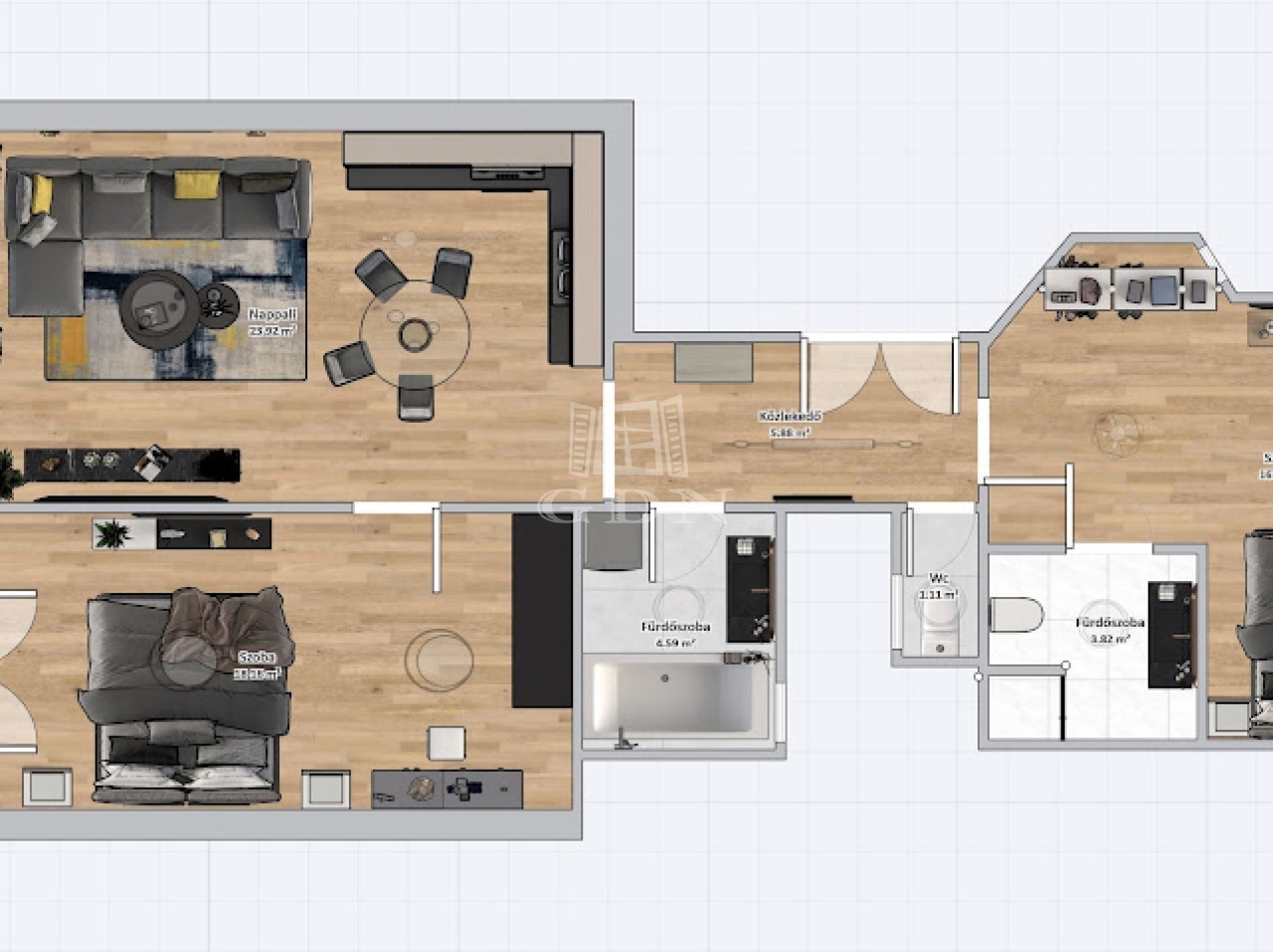 • Két fürdőszoba: külön zuhanyzós és kádas