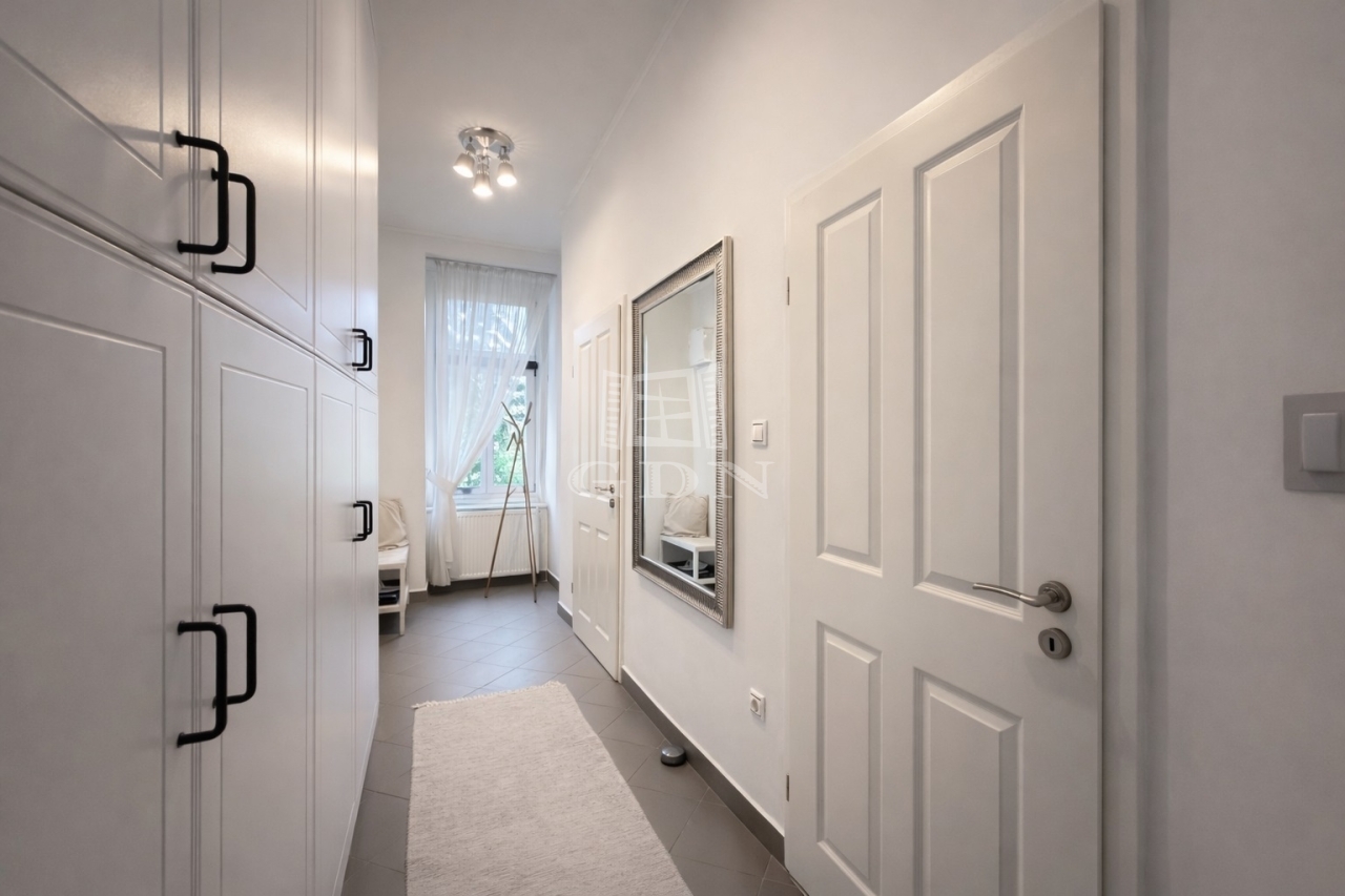Az ablakok cseréltek, fa keretben hőszigetelt üvegezéssel ellátottak. A közlekedőben, konyhában, fürdőben és WC-ben járólap, míg a szobákban szép állapotú, halszálka mintában lerakott tölgyfa parketta található.
