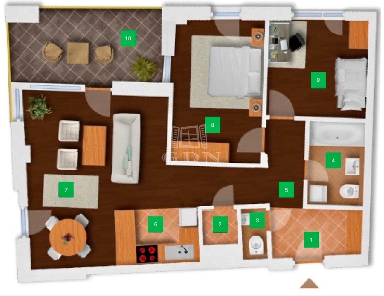 előtér(4.22m2), közlekedő(3.25m2), tároló(1,11m2), nappali(24.55m2), konyha(4.26m2), 2 szoba(12.67m2, 9.27m2), fürdőszoba+Wc(4.61m2), Wc(1.35m2), erkély(11m2).