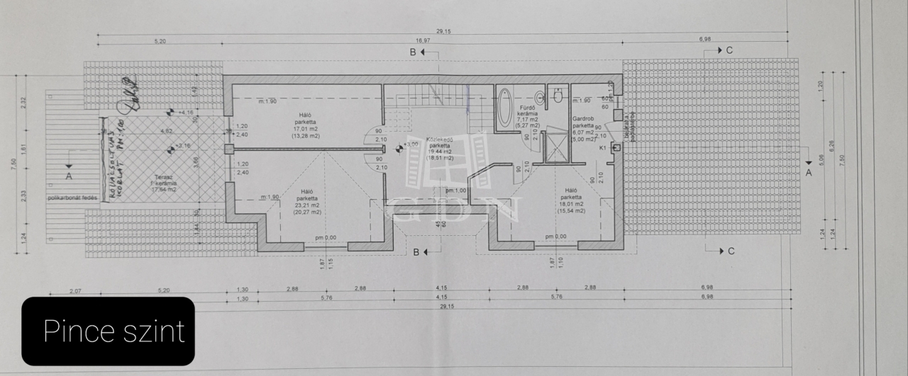A klimatizált felső szintre, kényelmes fokkiosztású stabil lépcsőn juthatunk fel, ahol egy 19,4nm (nettó 18,5) közlekedő, három egyenként 17nm (nettó 13,2), 23,2nm (nettó 20,2) és 18nm (nettó 15,5) szoba, valamint egy 6nm (nettó 5) gardrób és 7,1nm (nettó 5,2) fürdőszoba került kialakításra.