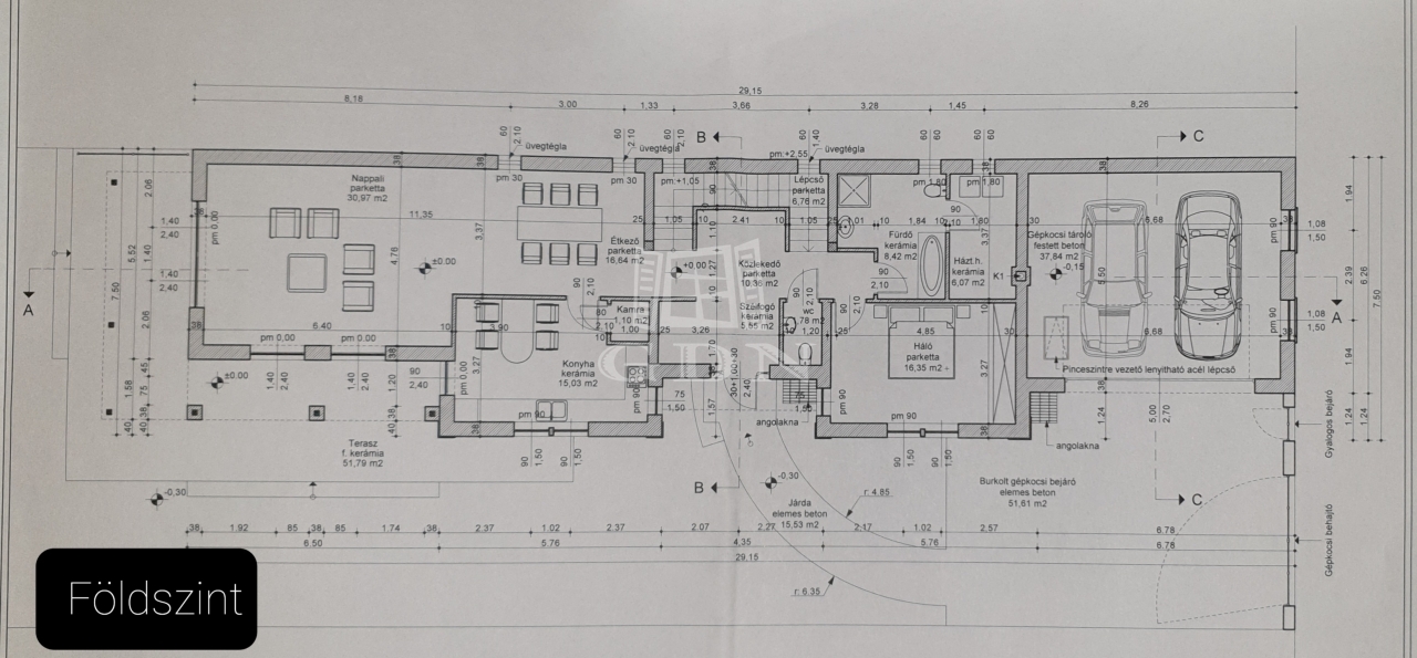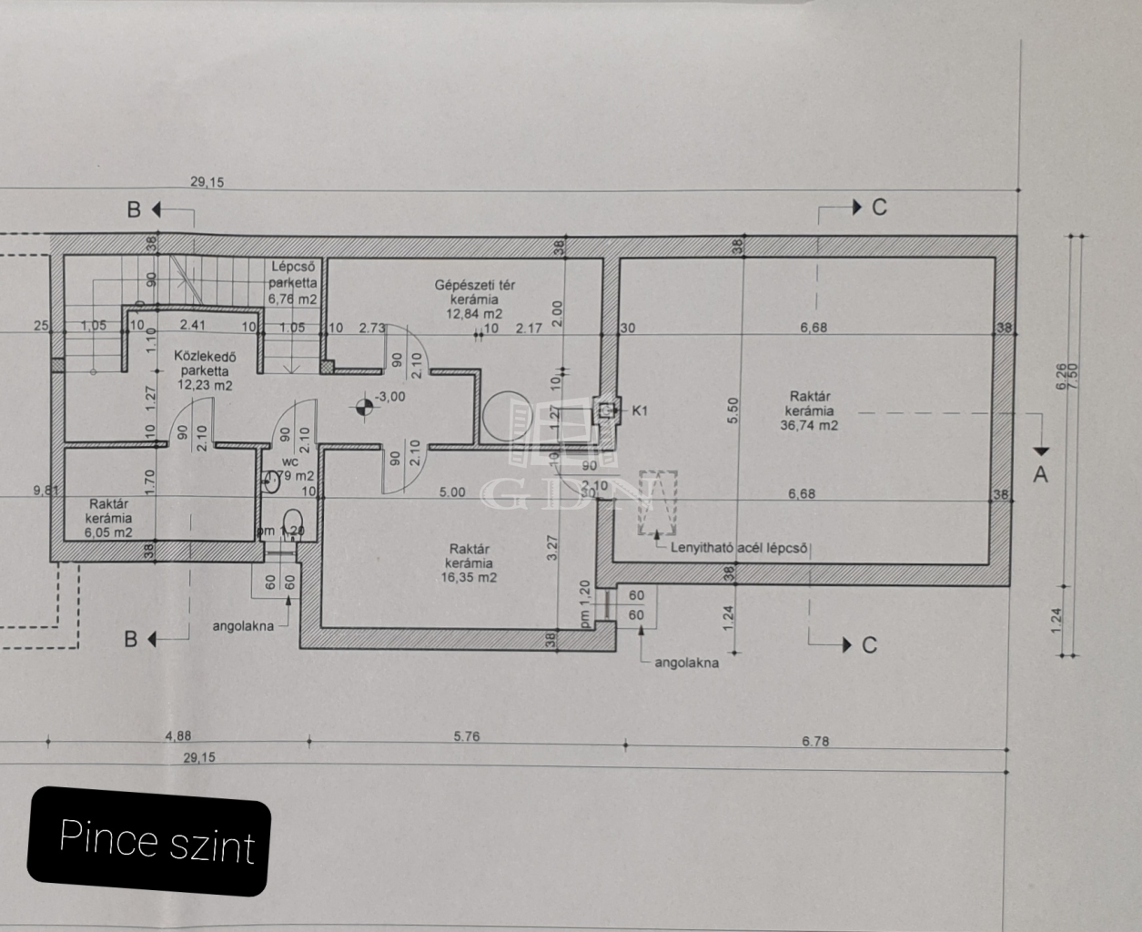 A garázsból nyílik a lejárat a 3méter belmagasságú 90nm-es pincerészbe.