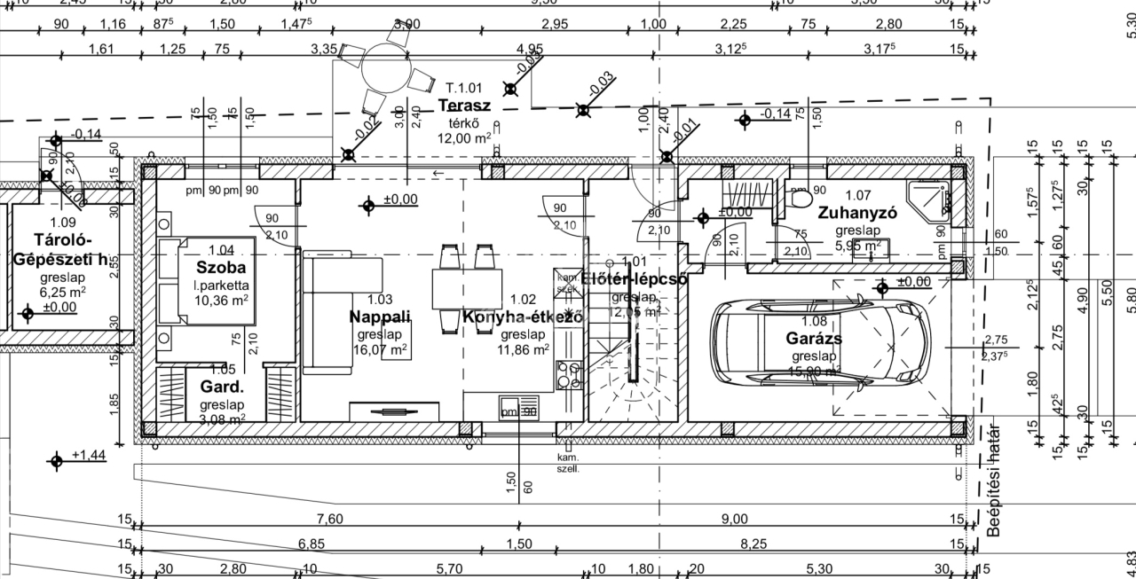 - A homlokzaton 15 cm vastagságú EPS80, a lábazaton 10 cm vastagságú XPS polisztirol alapú homlokzati hőszigetelő rendszer készül 2mm szemcsenagyságú dörzsölt vakolattal törtfehér kivitelben. A lábazat igazodik a cserép színéhez.
