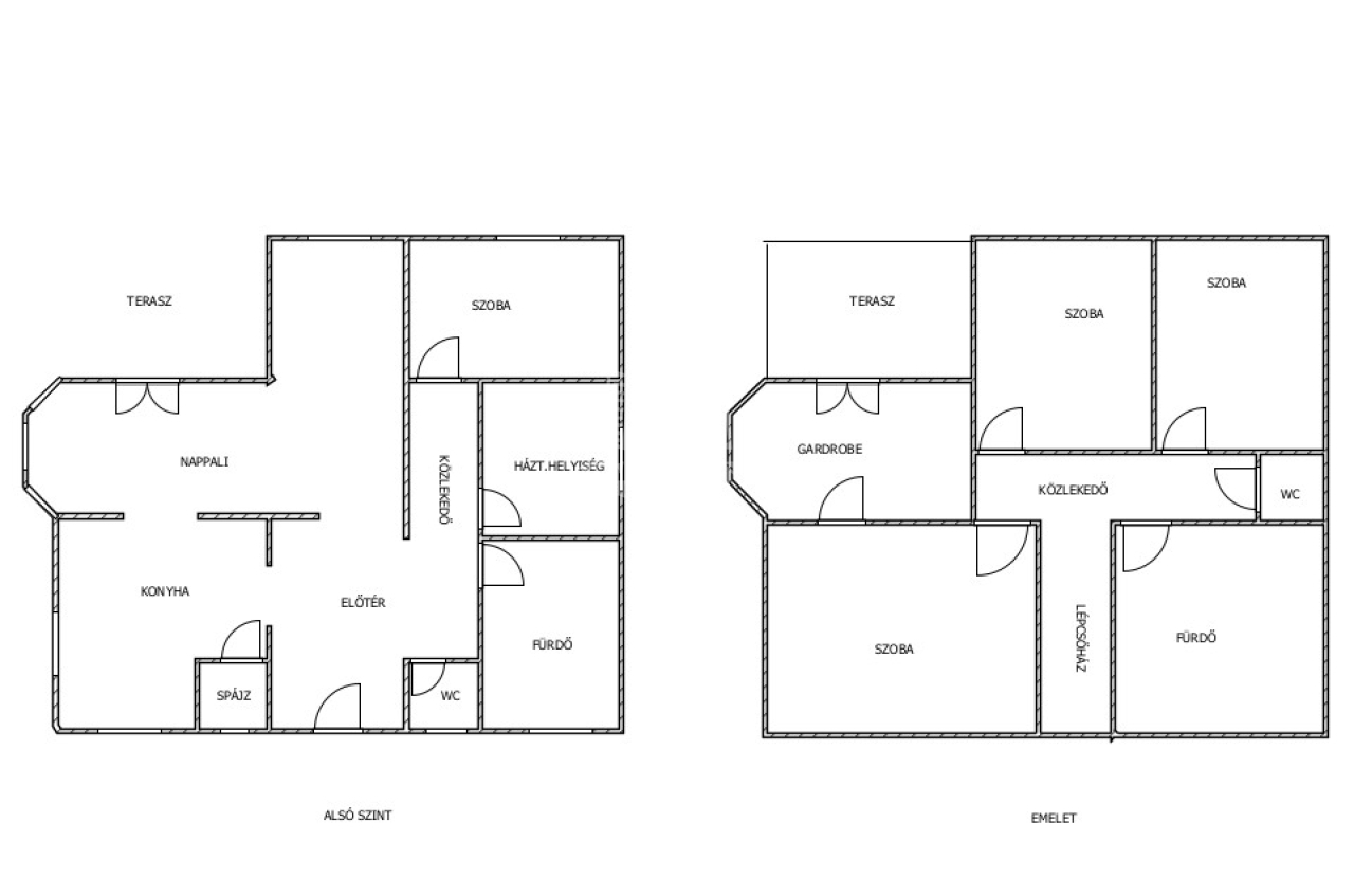 A földszinten kapott helyet a 42 m2 nappali, kandallóval, ami nem csak látványos, de jelentős hőt is termel. Klasszikus konyha, kamra, fürdőszoba, külön WC, hálószoba, háztartási helyiség.