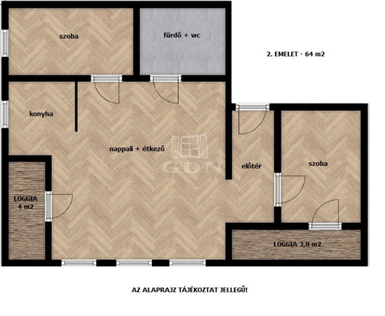 2. EMELET: 64 m2 – 3 szoba – 1 fürdő – LOGGIA: 8 m2