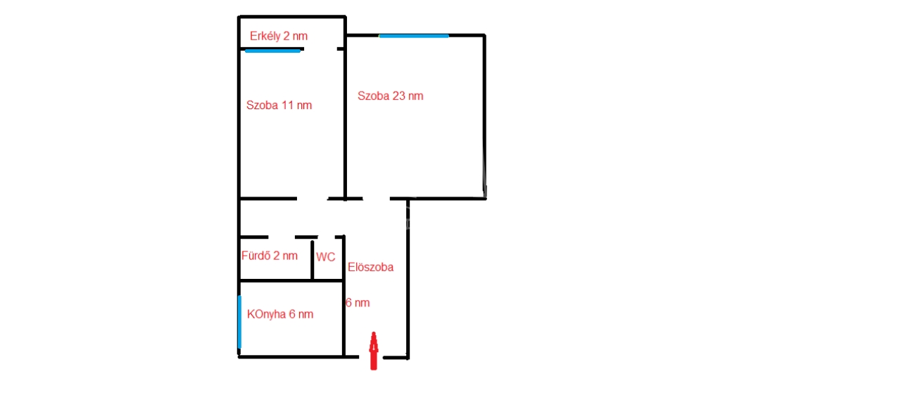 Belépve a 6 nm-es előszobába érkezünk, bal oldalon találjuk az ablakos 6 nm-es konyhát, szemből lépünk a 23 nm-es nappali szobába, mellette kapott helyet a kisebbik 11 nm-es szoba a helyiségből tudunk kilépni a 2 nm-es beüvegezett erkélyre.