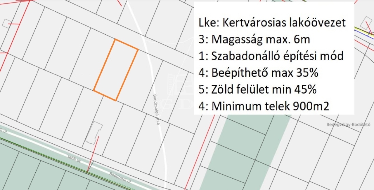 A telek beépíthetősége 30%, a megengedett építménymagasság 6 méter.