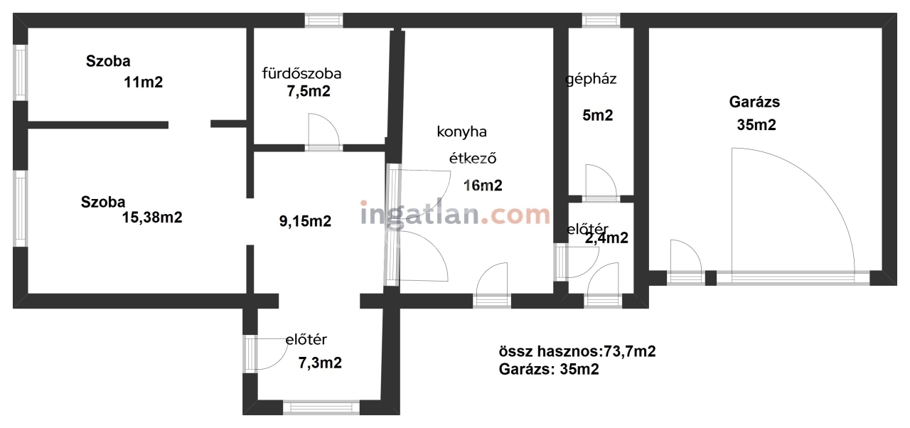 A ház 74 m2 hasznos alapterületű, 35m2-es garázs elosztását tekintve: