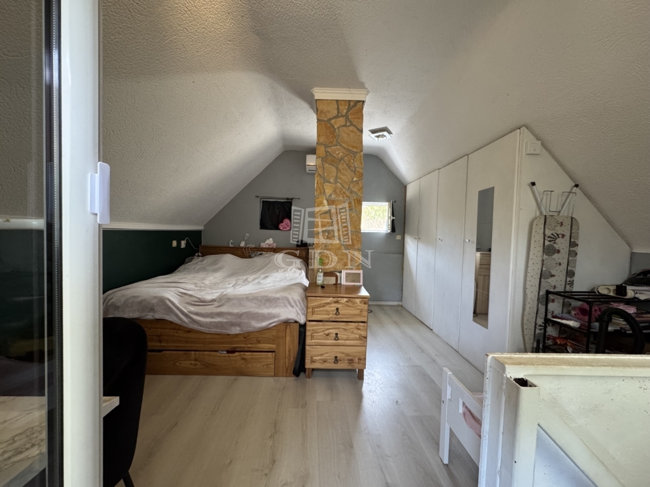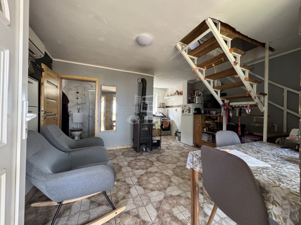 Nappali-konyha-étkező, fürdőszoba található a földszinten. A tetőtéri rész hálószobaként funkcionál, kapcsolódik hozzá egy erkély is.