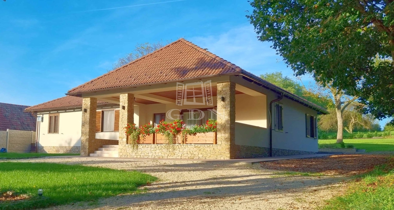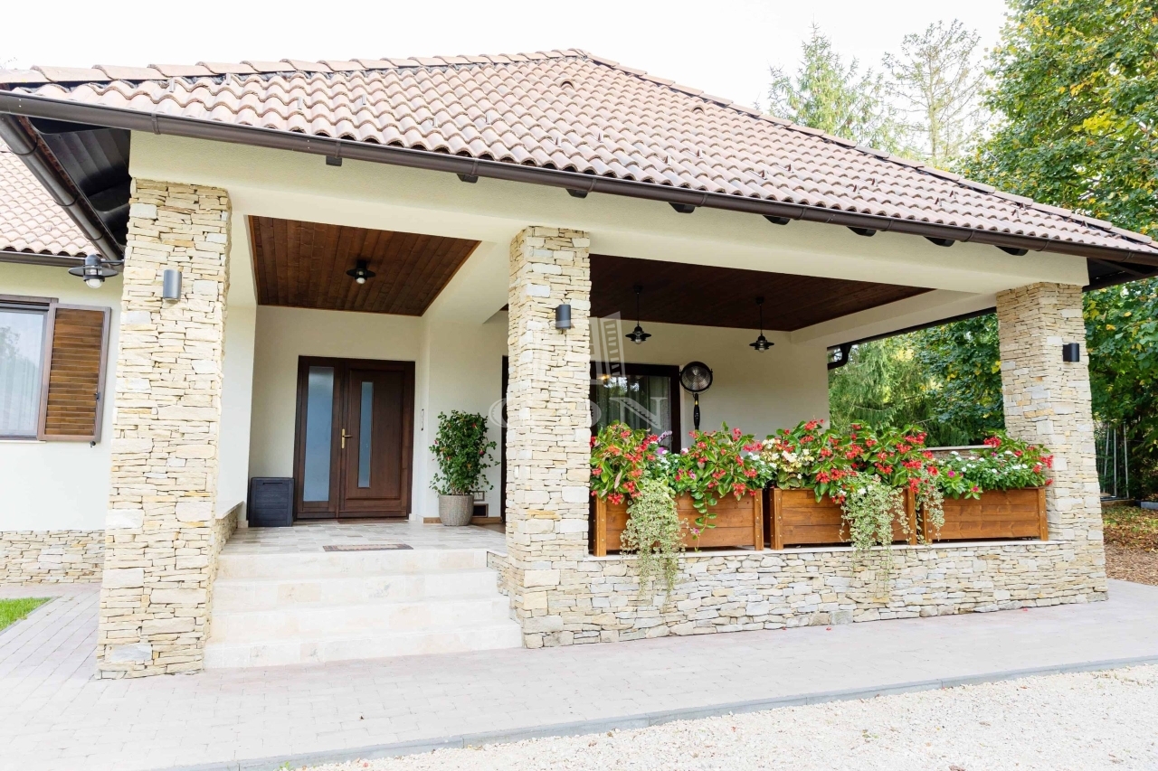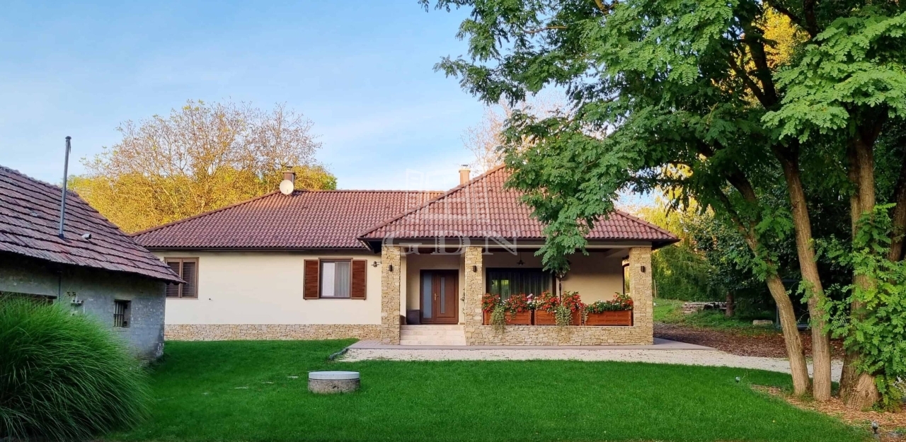 Ez a 145 m²-es családi ház gyönyörű dombos tájon, erdőkkel körülvéve helyezkedik el. Az ingatlan Pápa zöldövezeti részén található, egy 9 800 m²-es telken, ahol két épület is helyet kapott.