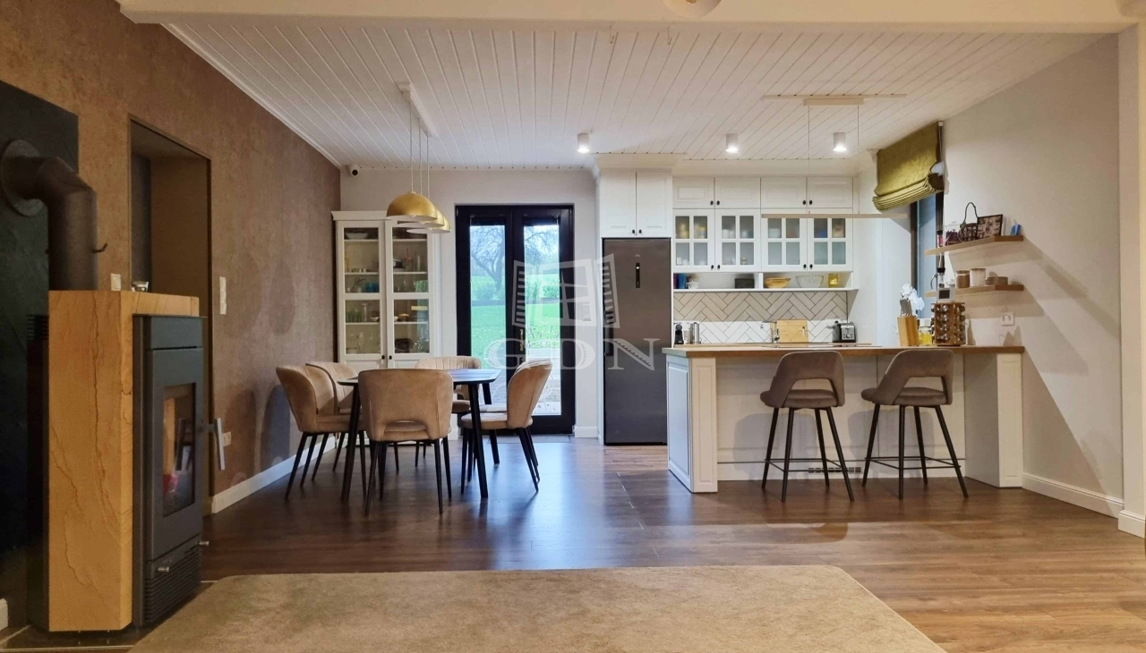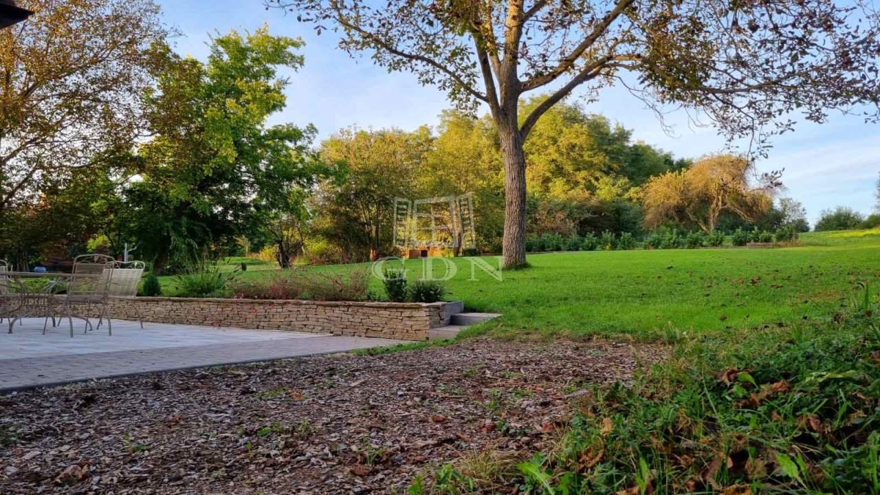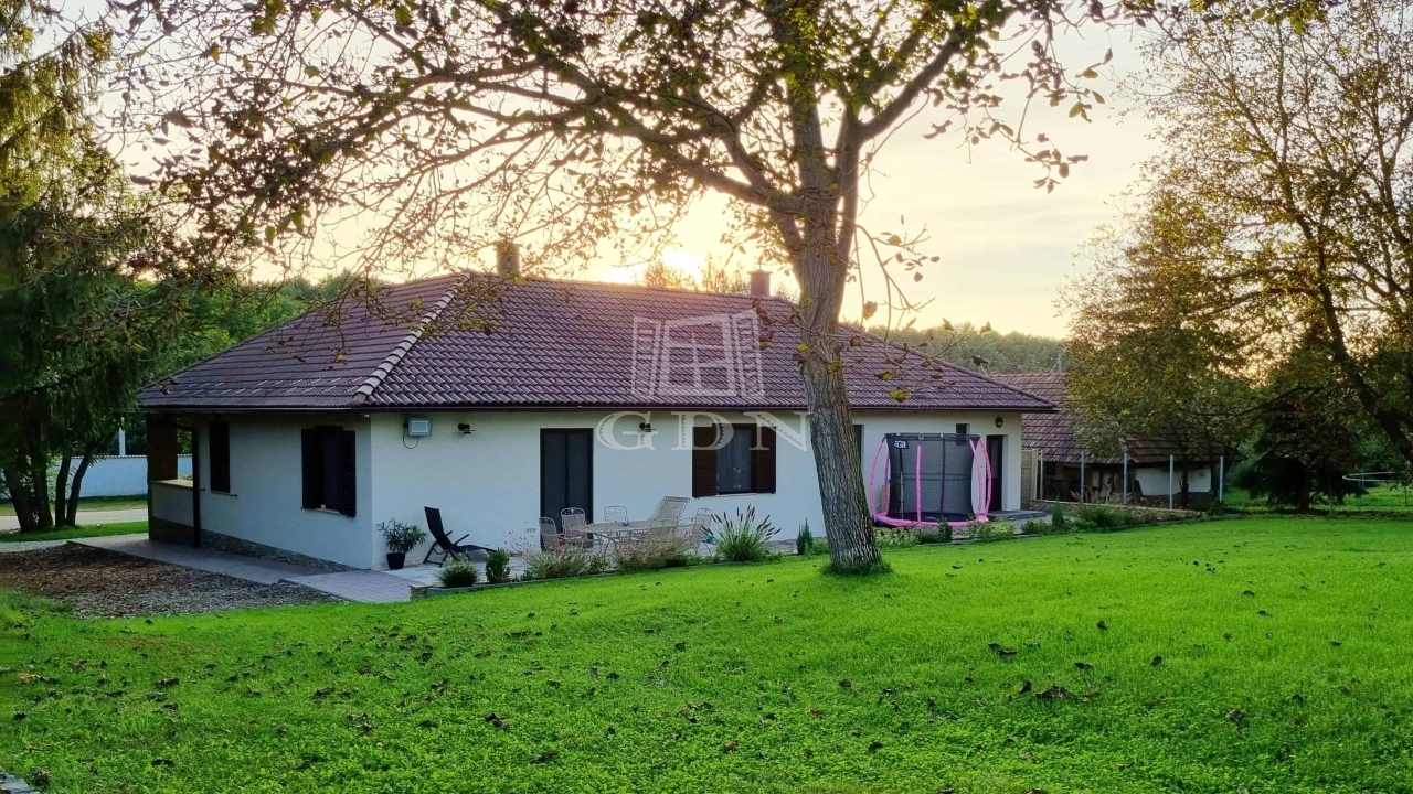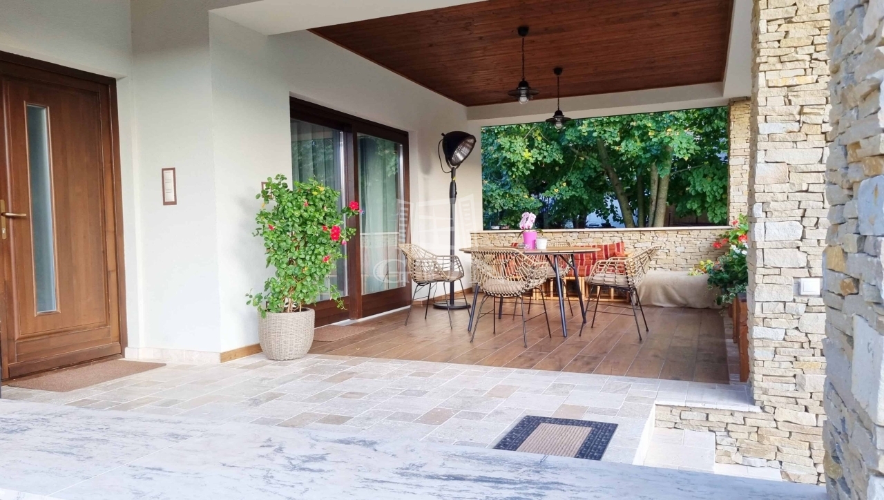 Ez a 145 m²-es családi ház gyönyörű dombos tájon, erdőkkel körülvéve helyezkedik el. Az ingatlan Pápa zöldövezeti részén található, egy 9 800 m²-es telken, ahol két épület is helyet kapott.