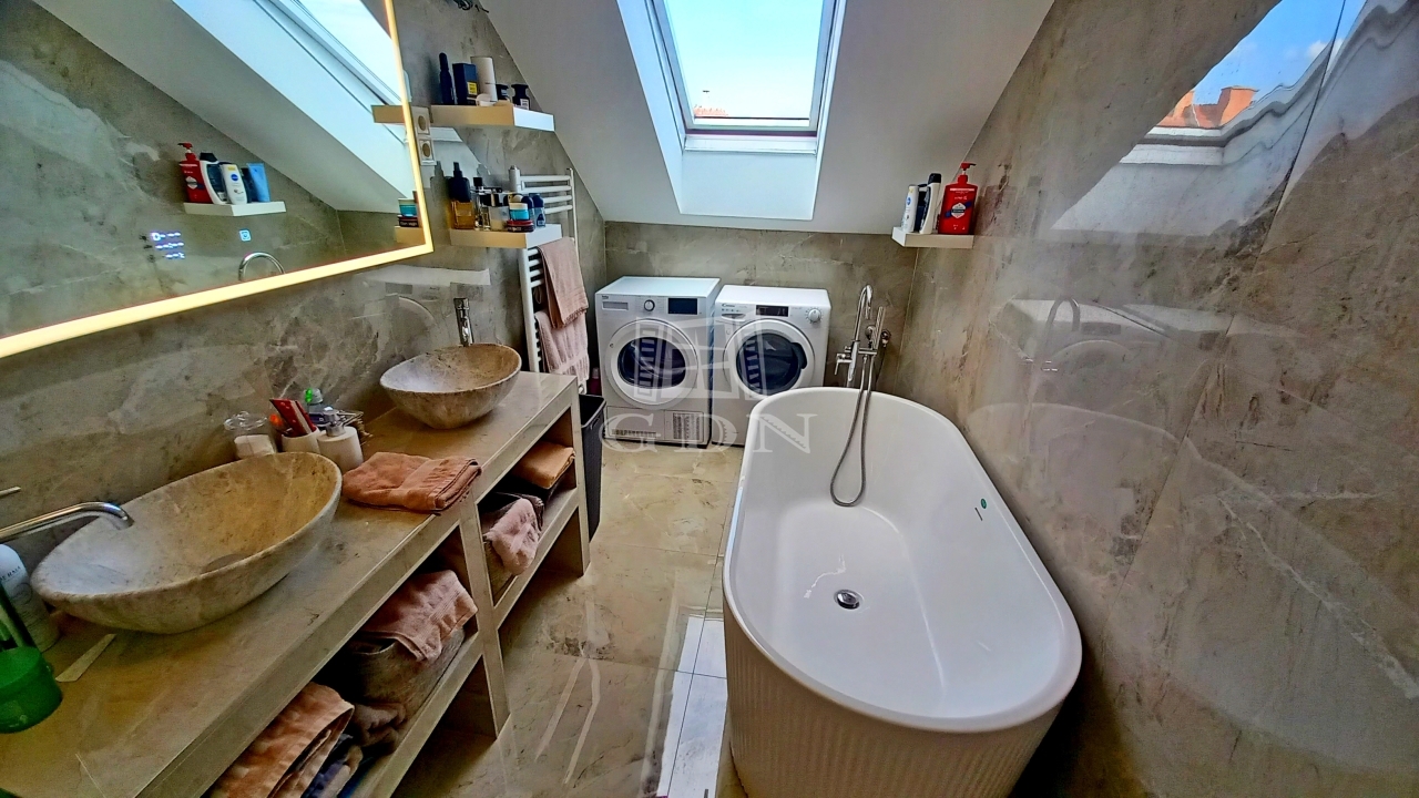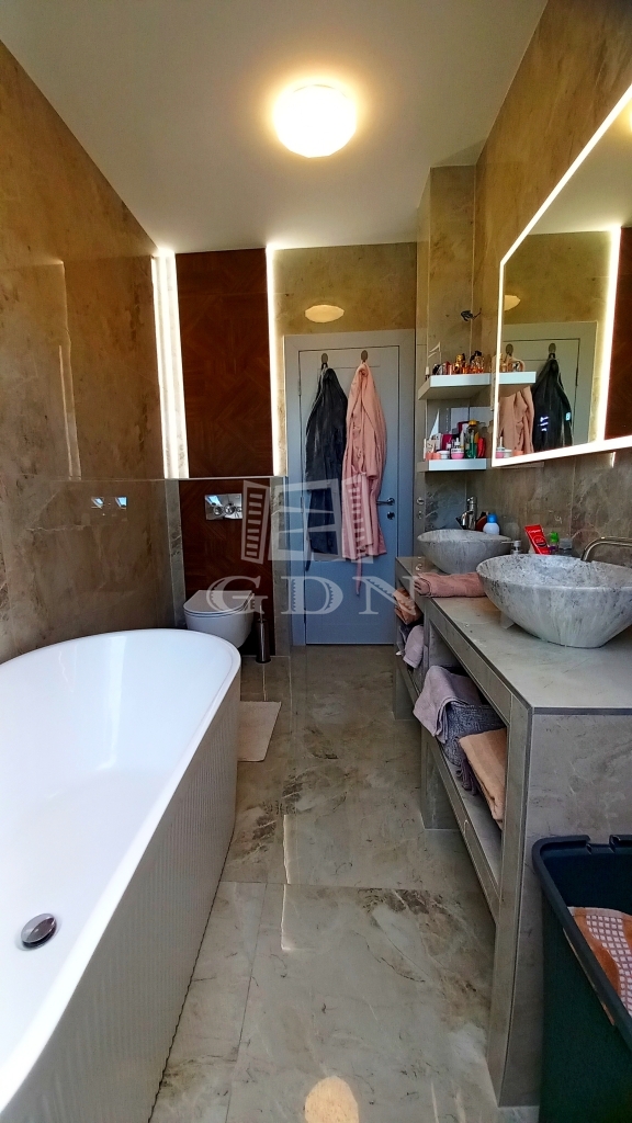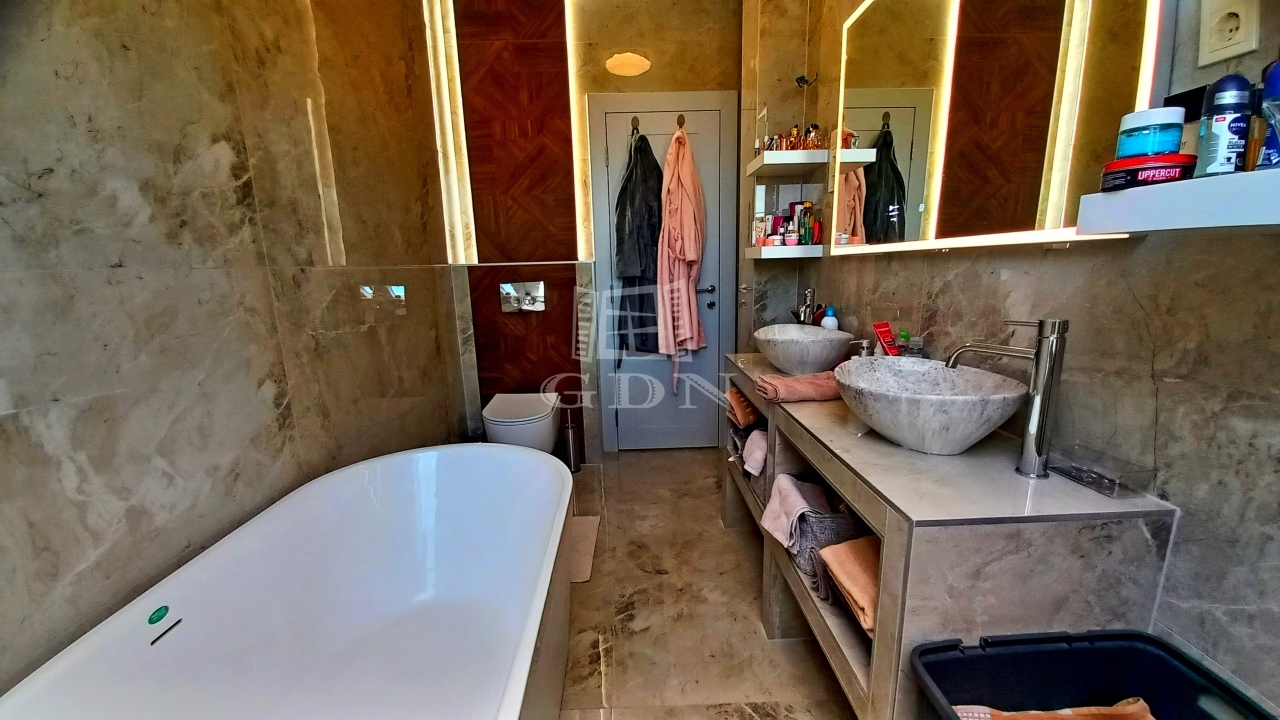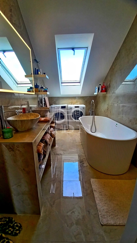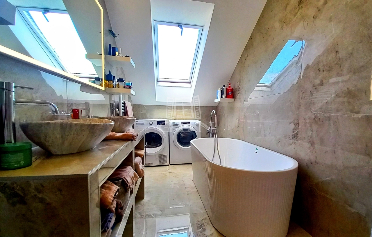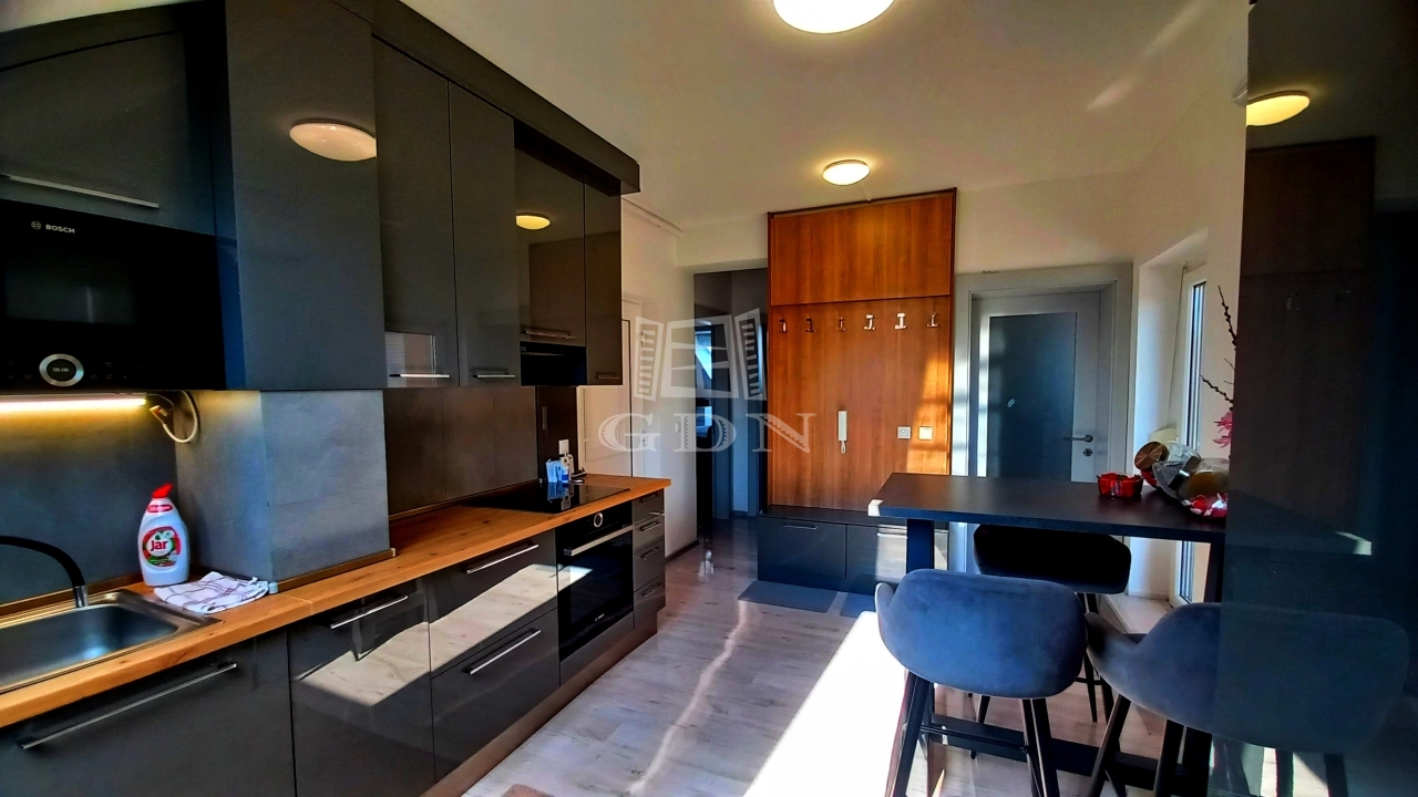 A konyha-étkező magas minőségű konyhabútorral szerelt, a fürdőszobában prémium burkolatok és szaniterek vannak. A lakás az épület harmadik emeletén van, melyhez tartozik egy 24 négyzetméteres terasz.